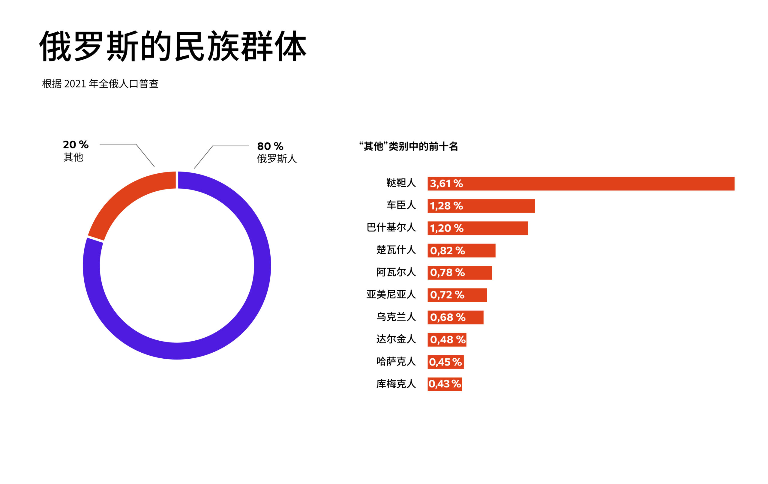 俄罗斯是一个多民族国家。国内居住着超过190个不同民族。其中包括小型土著群体和规模较大的原住民族,这些民族的起源可追溯至其世代居住的土地。俄罗斯民族中只有六个民族的人口超过一百万:俄罗斯人、鞑靼人、车臣人、楚瓦什人、巴什基尔人和阿瓦尔人。