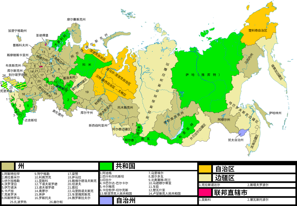 俄罗斯是联邦制国家。它由 89 个地区组成,这些地区被称为联邦主体,包括共和国、城市、州、区和边疆区。各地区的运作遵循既定原则: