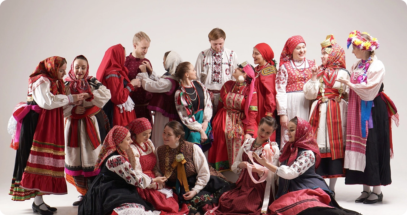 Один из основных элементов фольклора — русский костюм, который может многое рассказать о культуре и быте наших предков. Главные элементы мужского традиционного костюма включали в себя: рубаху, кафтан, шапку и сапоги, а женский костюм представлял собой сарафан и кокошник. Каждый элемент имел свое символическое значение, а также выполнял практическую функцию.
