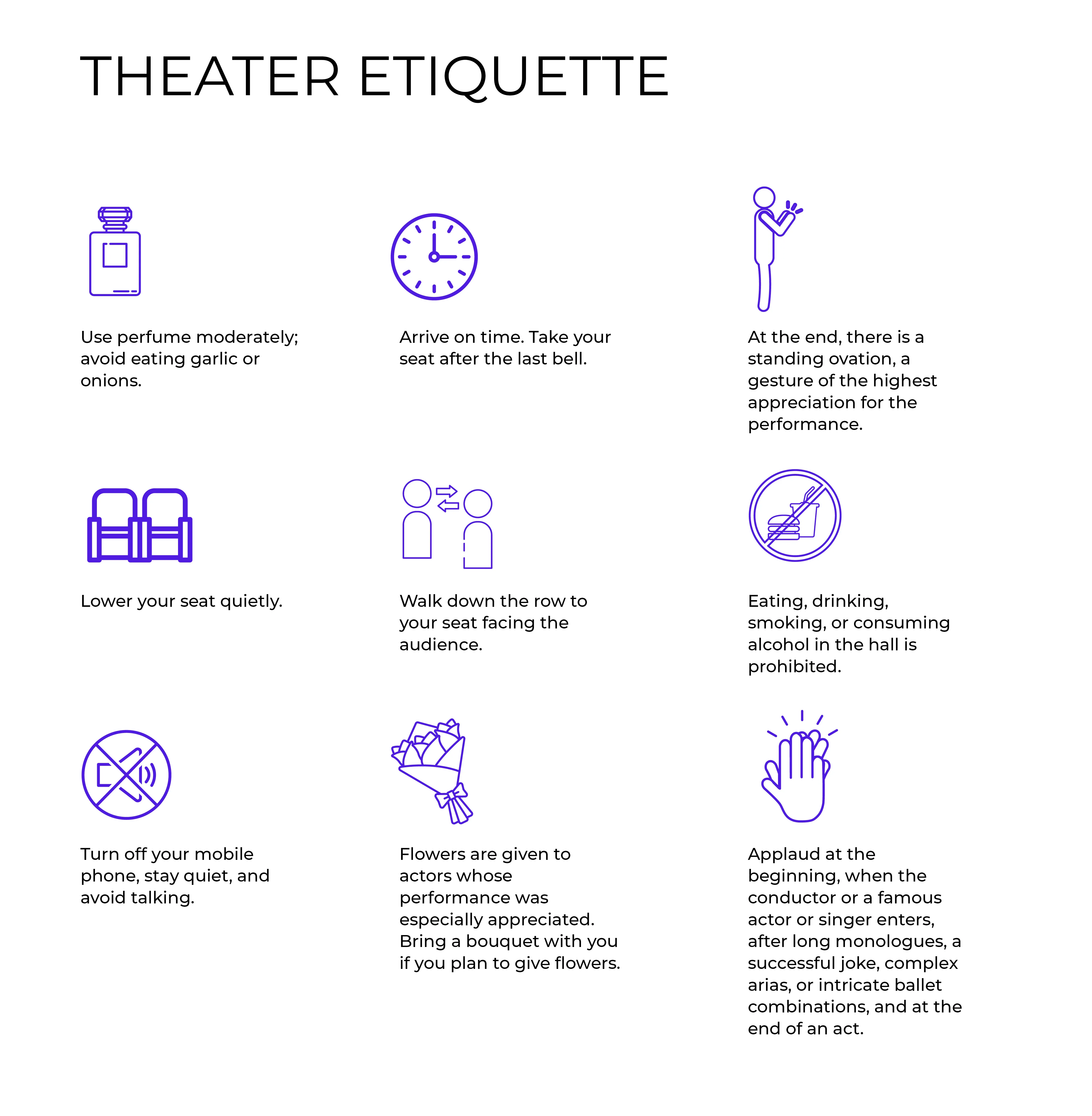 - You should avoid dishes with onions and garlic, as well as applying a lot of perfume before visiting the theater.