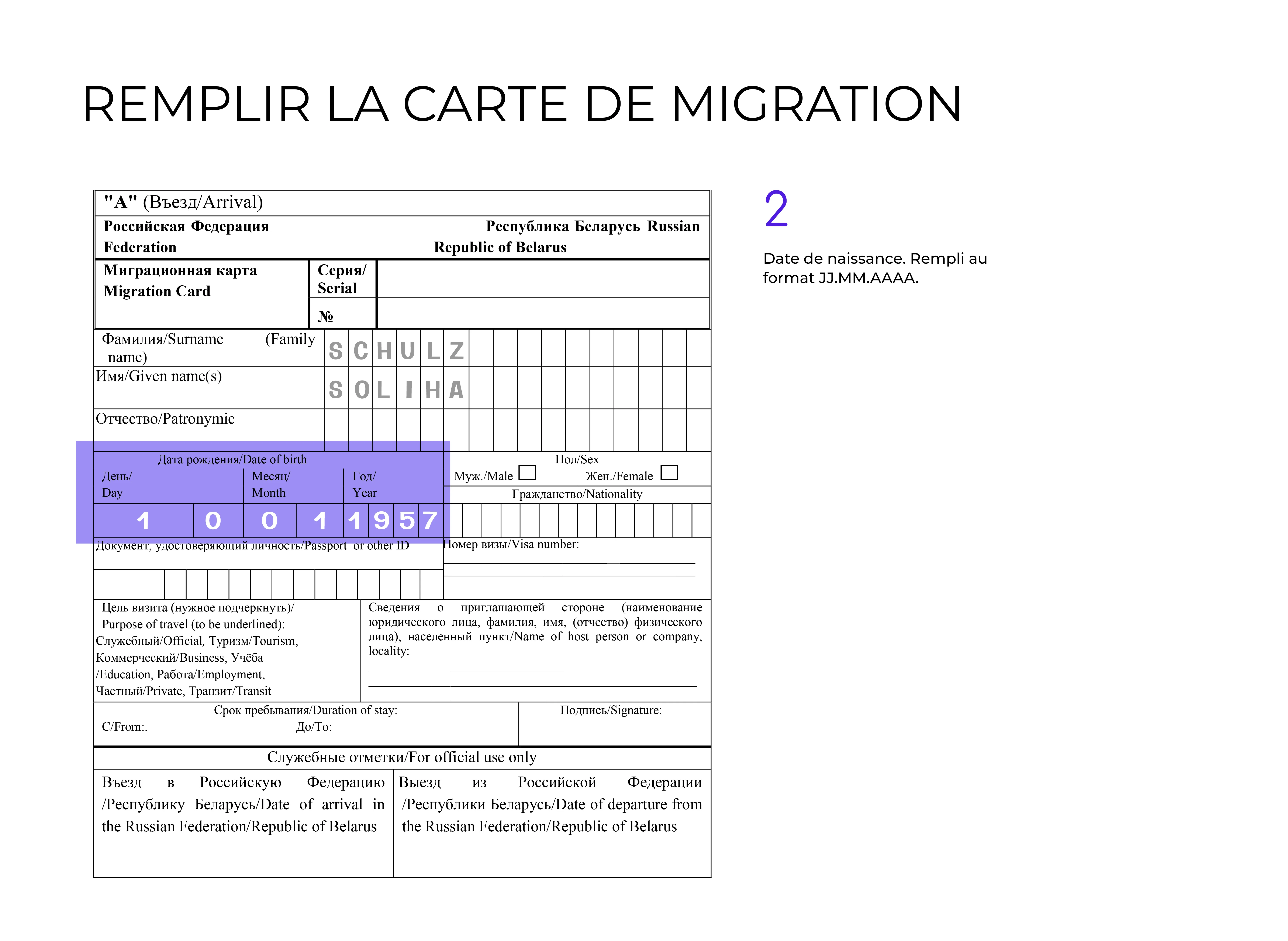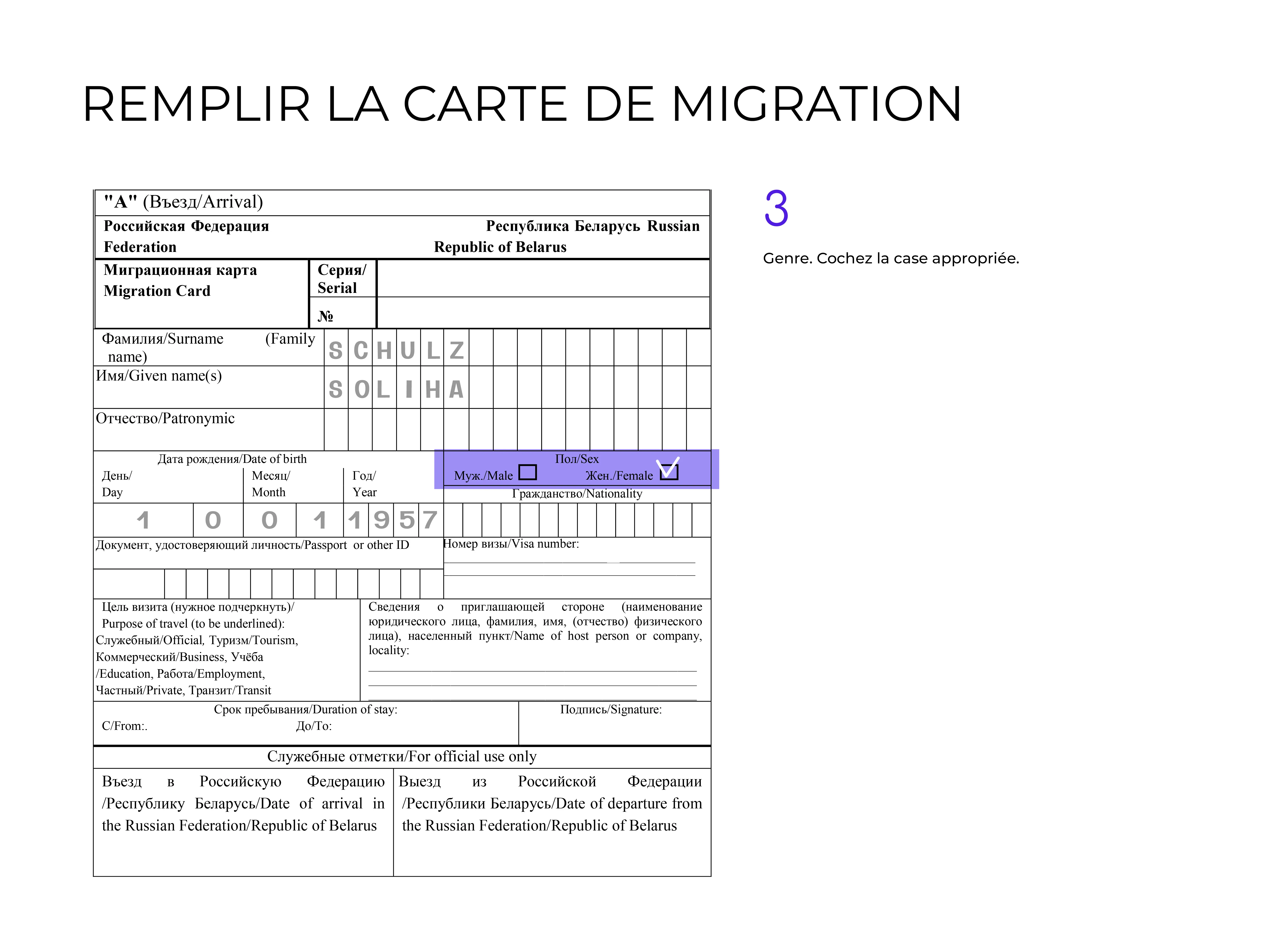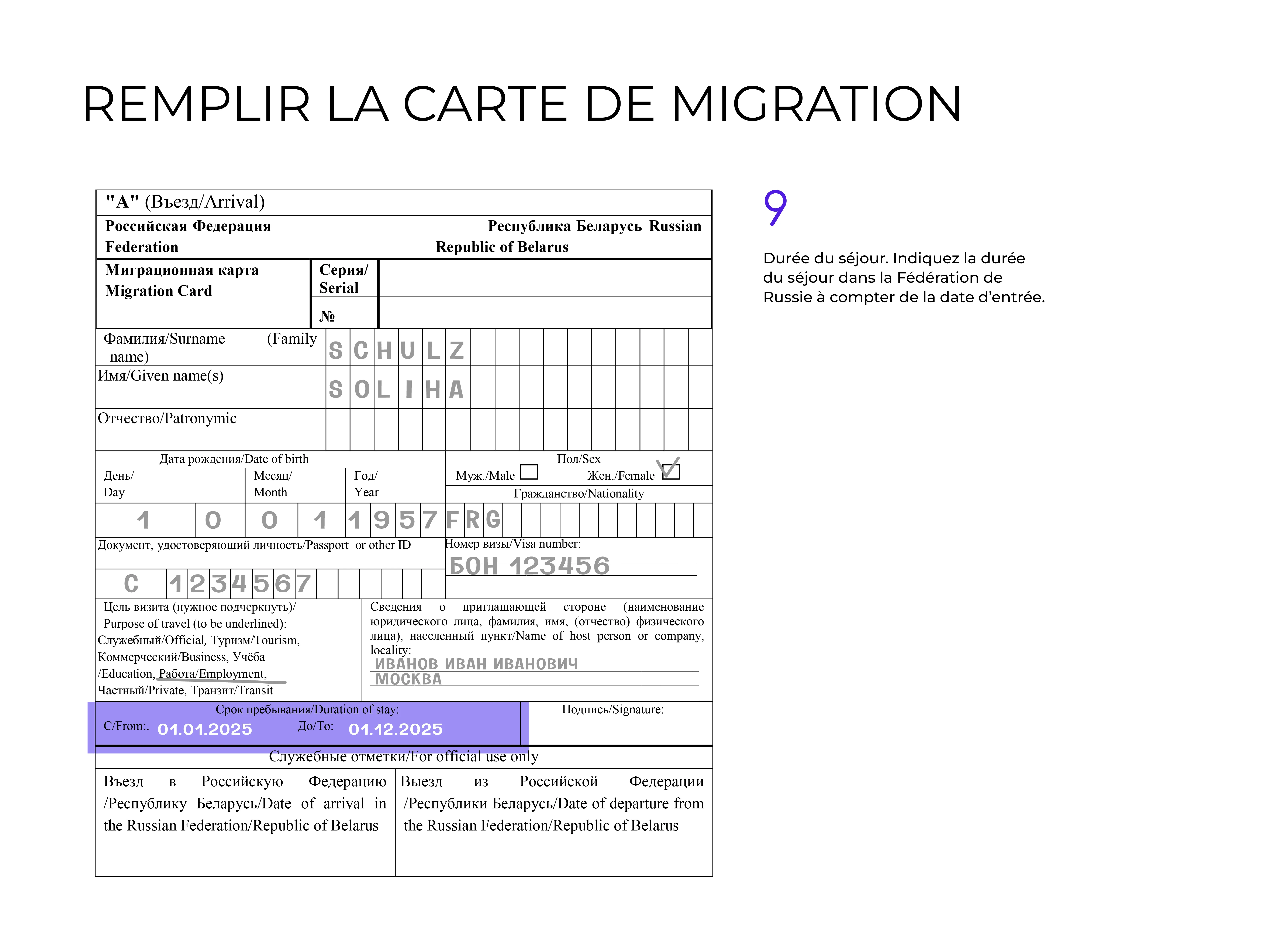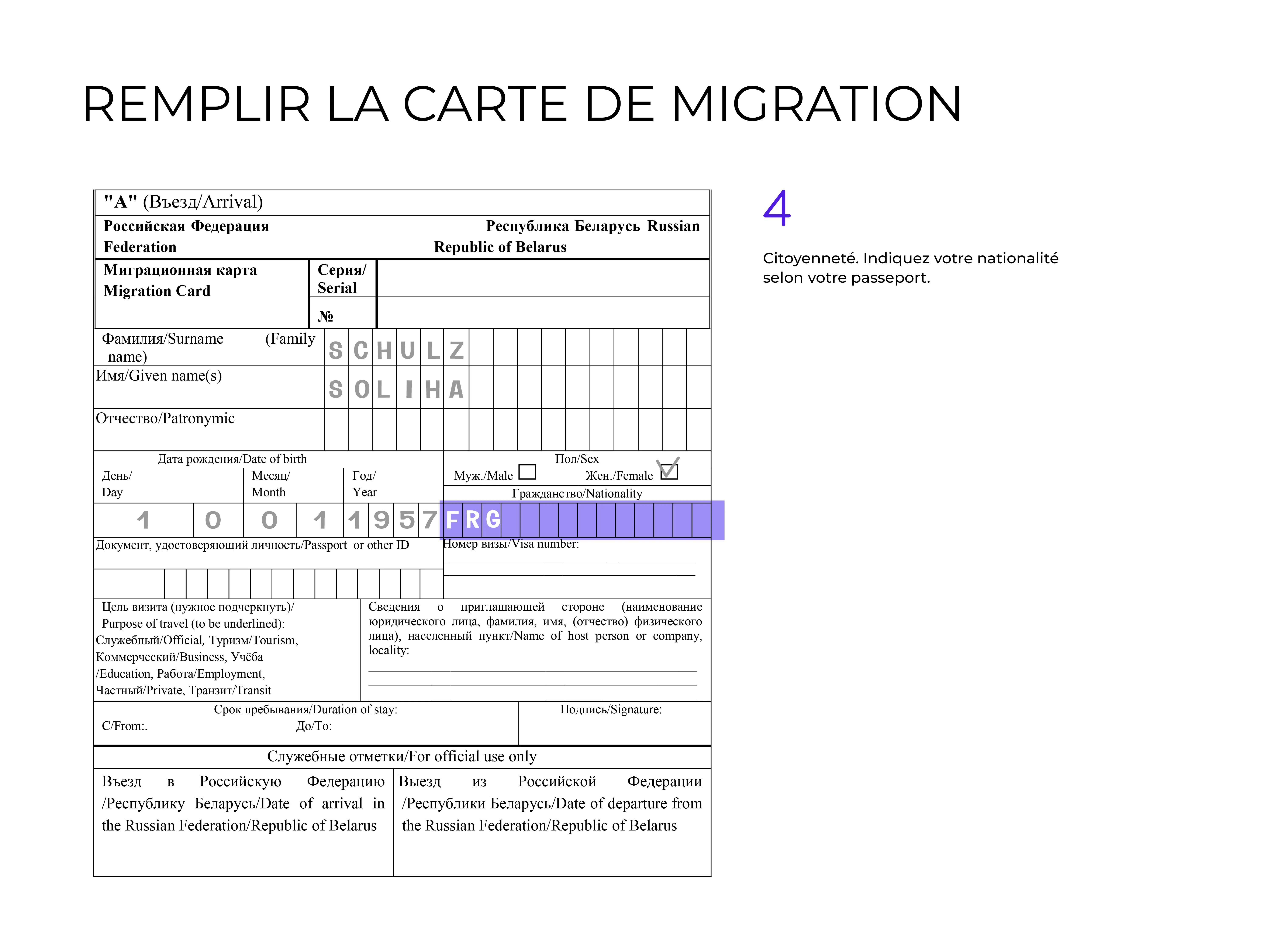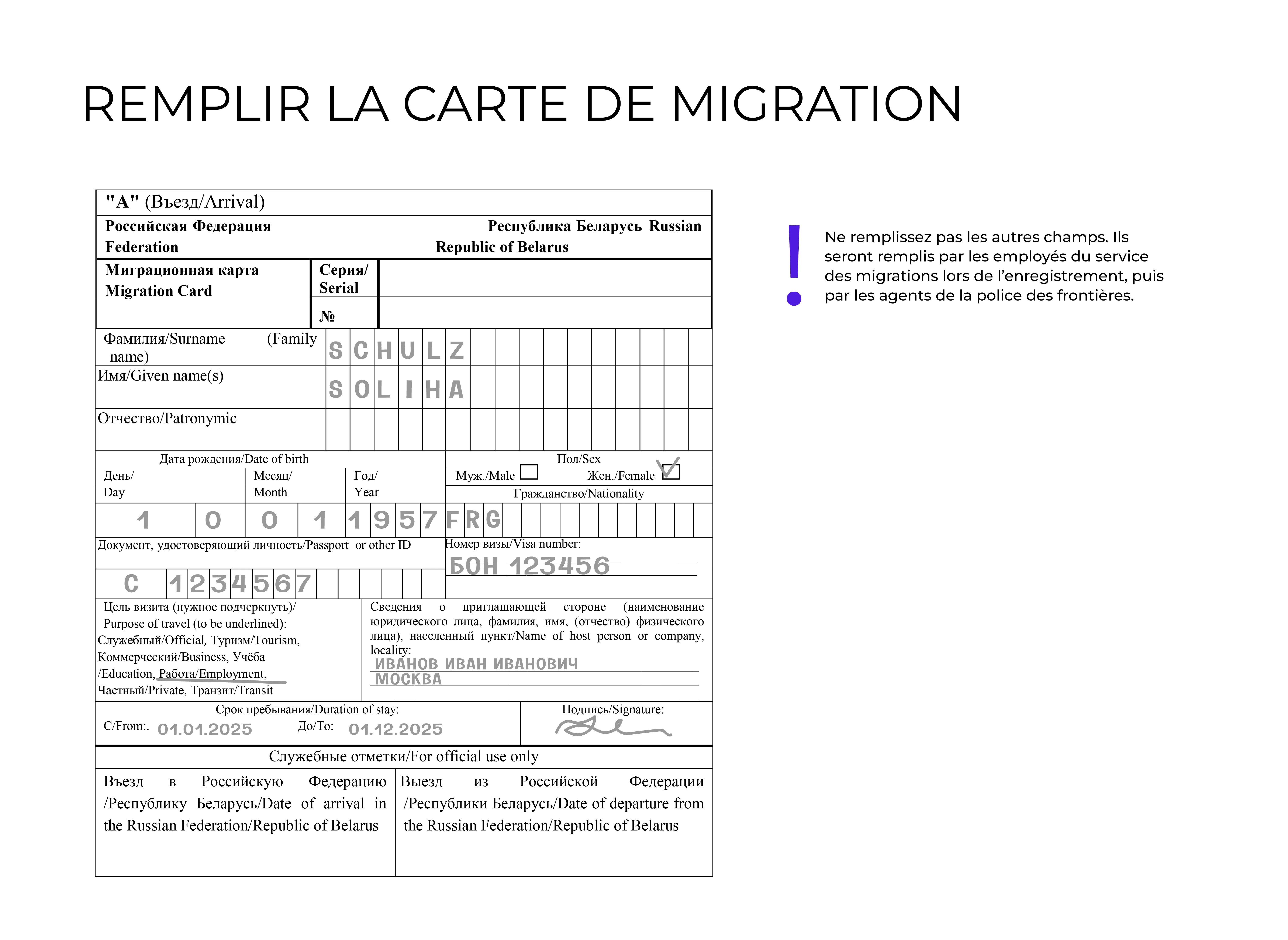 Lors de l’entrée en Fédération de Russie, le formulaire de carte de migration doit être obtenu auprès d’un agent de la police des frontières lors du contrôle des passeports.