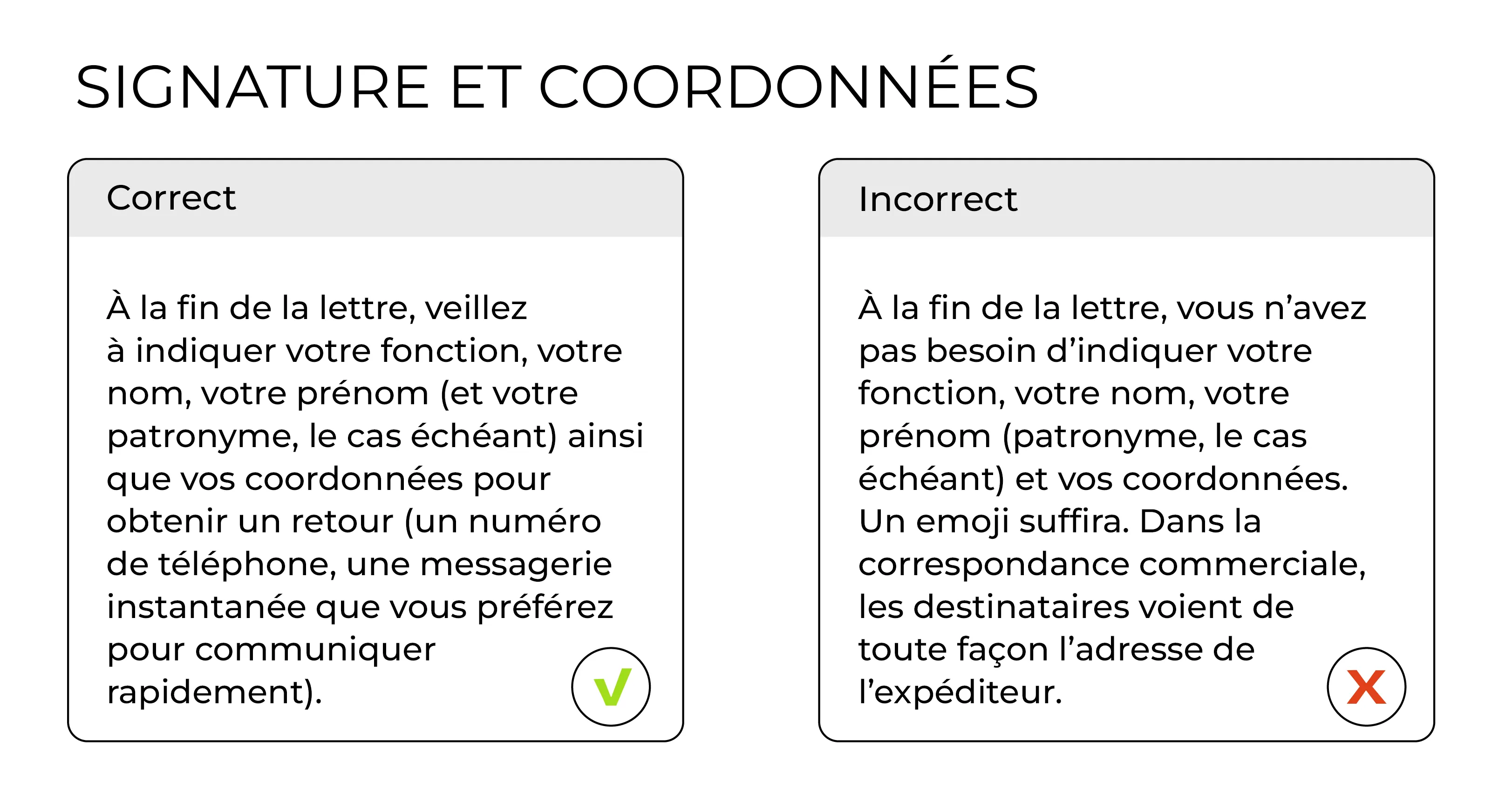 Ces bonnes pratiques s’appliquent à la rédaction de lettres classiques et d’e-mails. Il est recommandé de répondre aux e-mails dans les 24 heures suivant leur réception. Pour consulter les règles et les modèles de lettres, cliquez ici..