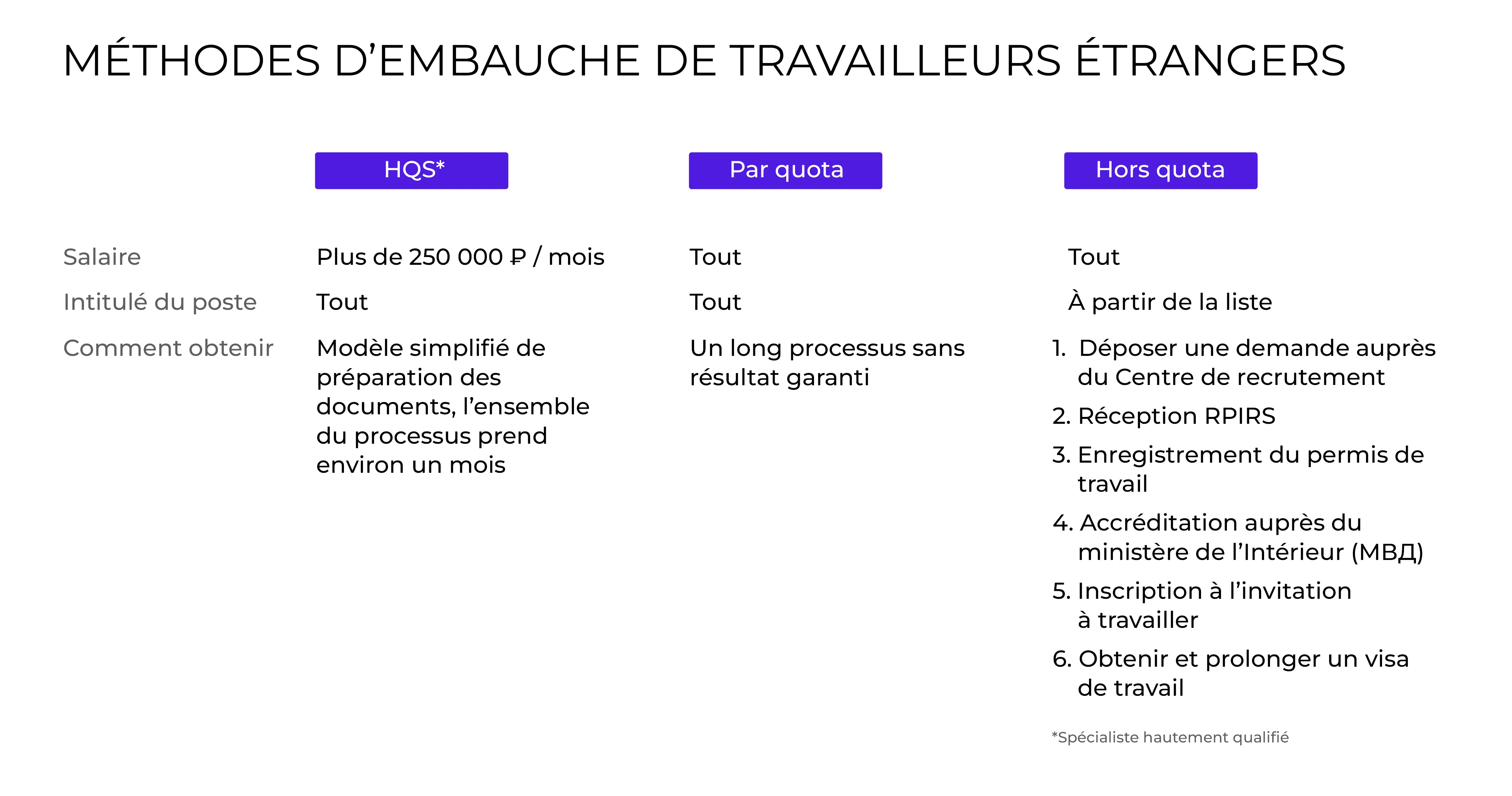 Convient au personnel hautement qualifié. Une période d’emploi pouvant aller jusqu’à 3 ans et un salaire avant impôts à partir de 3 millions de roubles par an. Un contrat de travail ou un contrat de droit civil (ГПХ) sera conclu avec vous. Veuillez tenir compte des exceptions. Vous ne devez pas travailler pour des entrepreneurs individuels (EI), dans des organisations spirituelles (religieuses et éducatives), des organisations préscolaires (maternelles, crèches, groupes d’accueil temporaire d’enfants) et des établissements scolaires. Vous aurez besoin d’un visa de travail et d’un permis de travail.