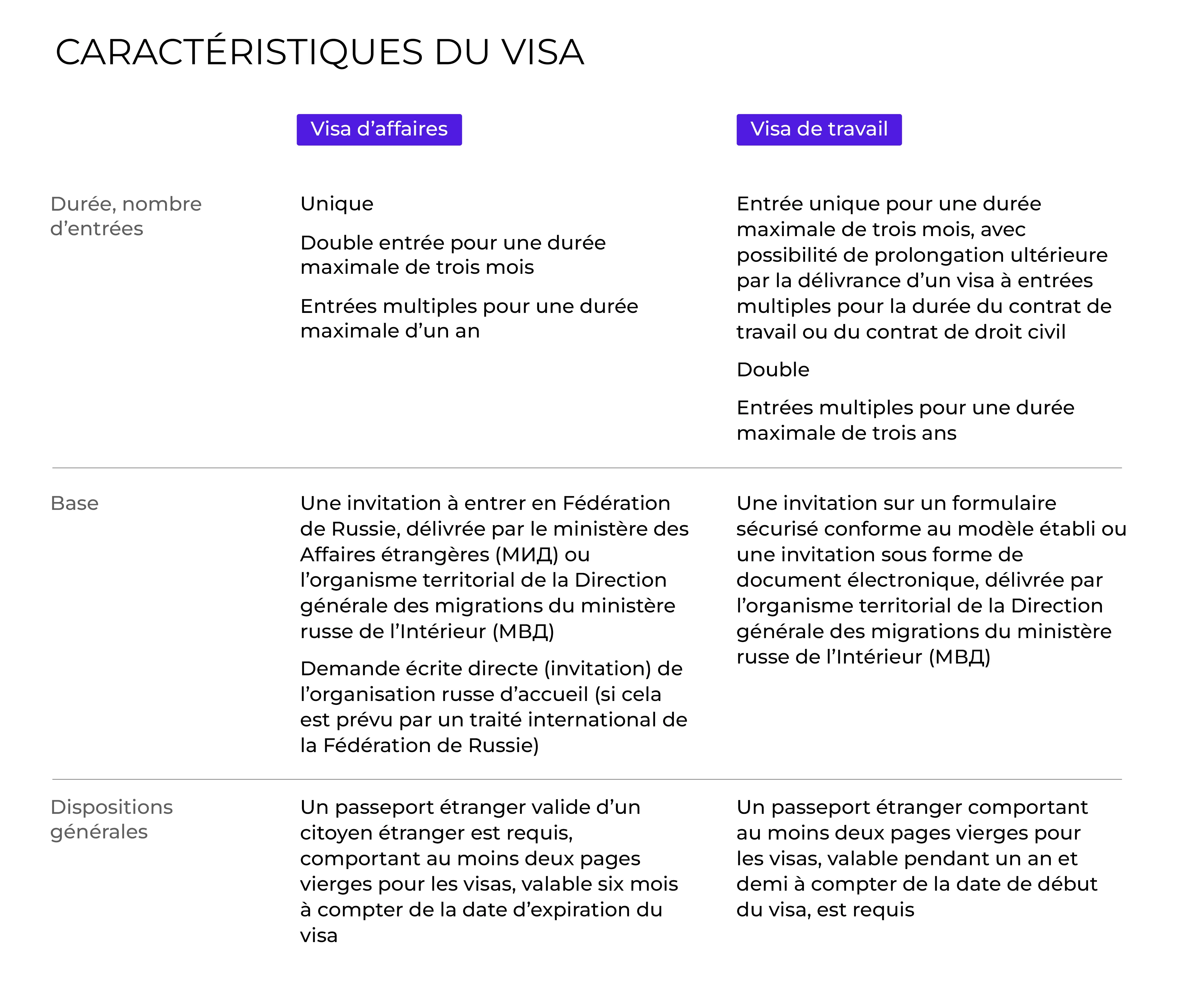 Il existe plus de 10 types de visas permettant aux ressortissants étrangers d’entrer en Russie. Les plus courants sont les visas d’affaires et de travail. Le tableau ci-dessous résume leurs principales caractéristiques.