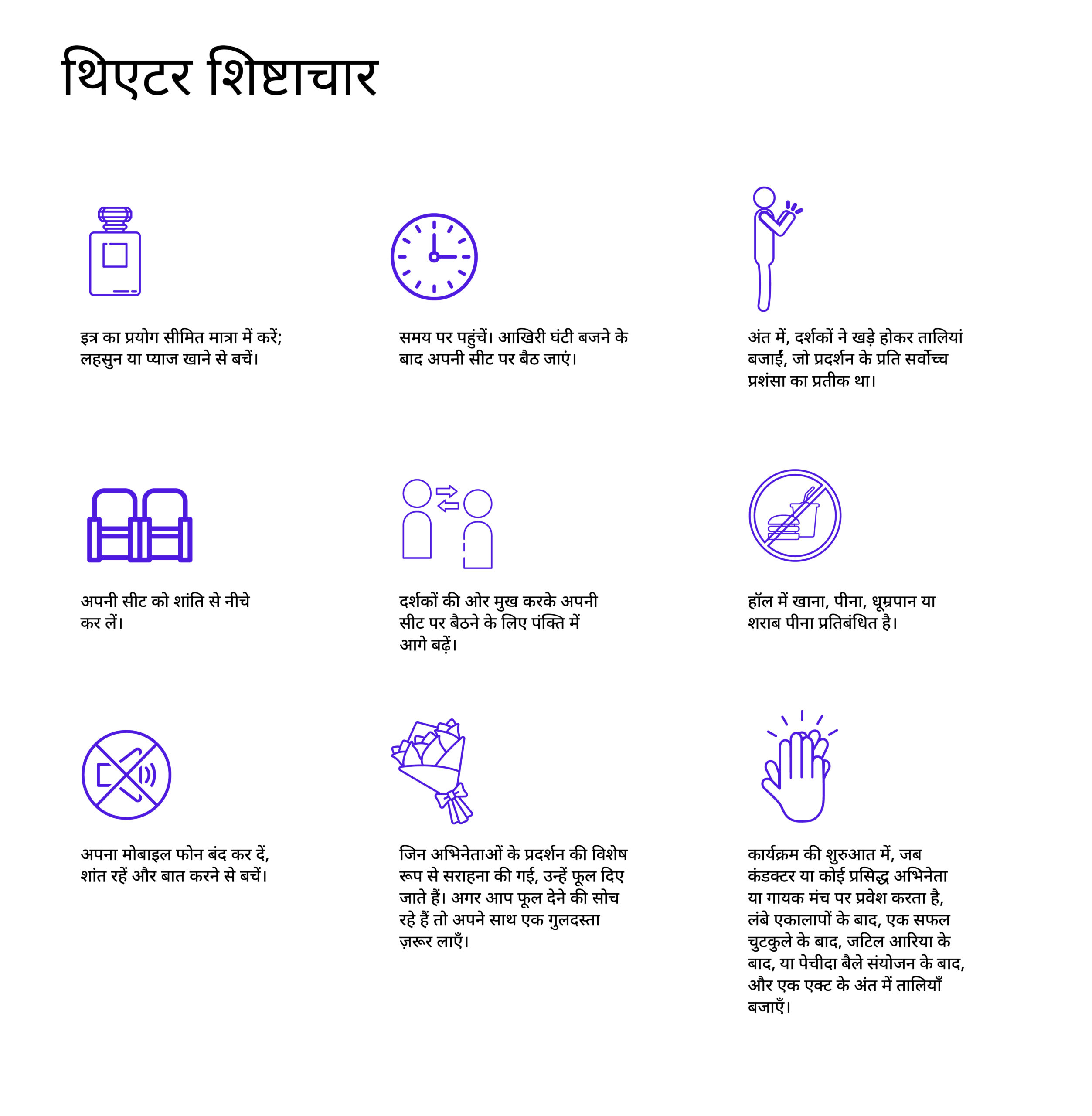 - अगर आपको कोई ज़रूरी काम आ जाए, तो आप इंटरवल के दौरान बाहर जा सकते हैं। प्रोग्राम चालू के दौरान हॉल से बाहर निकलना बुरा माना जाता है।