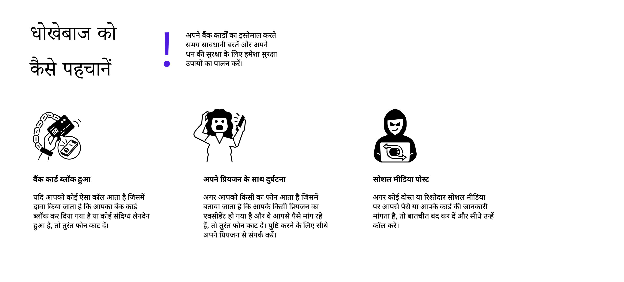 फ़ोन पर बात करते समय सतर्क और सावधान रहना ज़रूरी है। फ़ोन पर कभी भी अपना पासवर्ड या क्रेडिट कार्ड नंबर जैसी निजी जानकारी किसी दूसरे को न दें। कृपया याद रखें कि बैंक और कंपनियां फ़ोन पर ऐसी जानकारी नहीं माँगती हैं। अगर आपको कॉल की प्रामाणिकता के बारे में यकीन नहीं है, तो फ़ोन काट दें और भरोसेमंद संपर्क जानकारी का इस्तेमाल करके सीधे संबंधित संस्थान से संपर्क करें। सावधान रहें और अपने सहज-ज्ञान पर भरोसा करें – इससे आप स्कैमर्स के जाल में फँसने से बच सकते हैं।