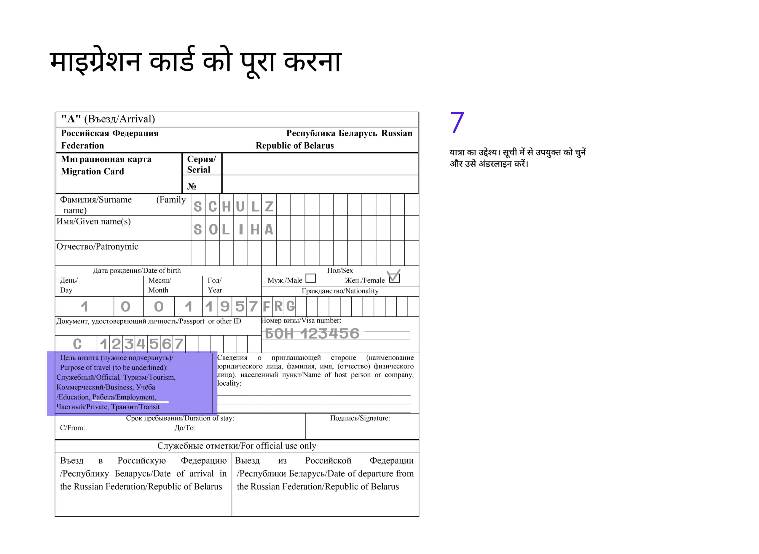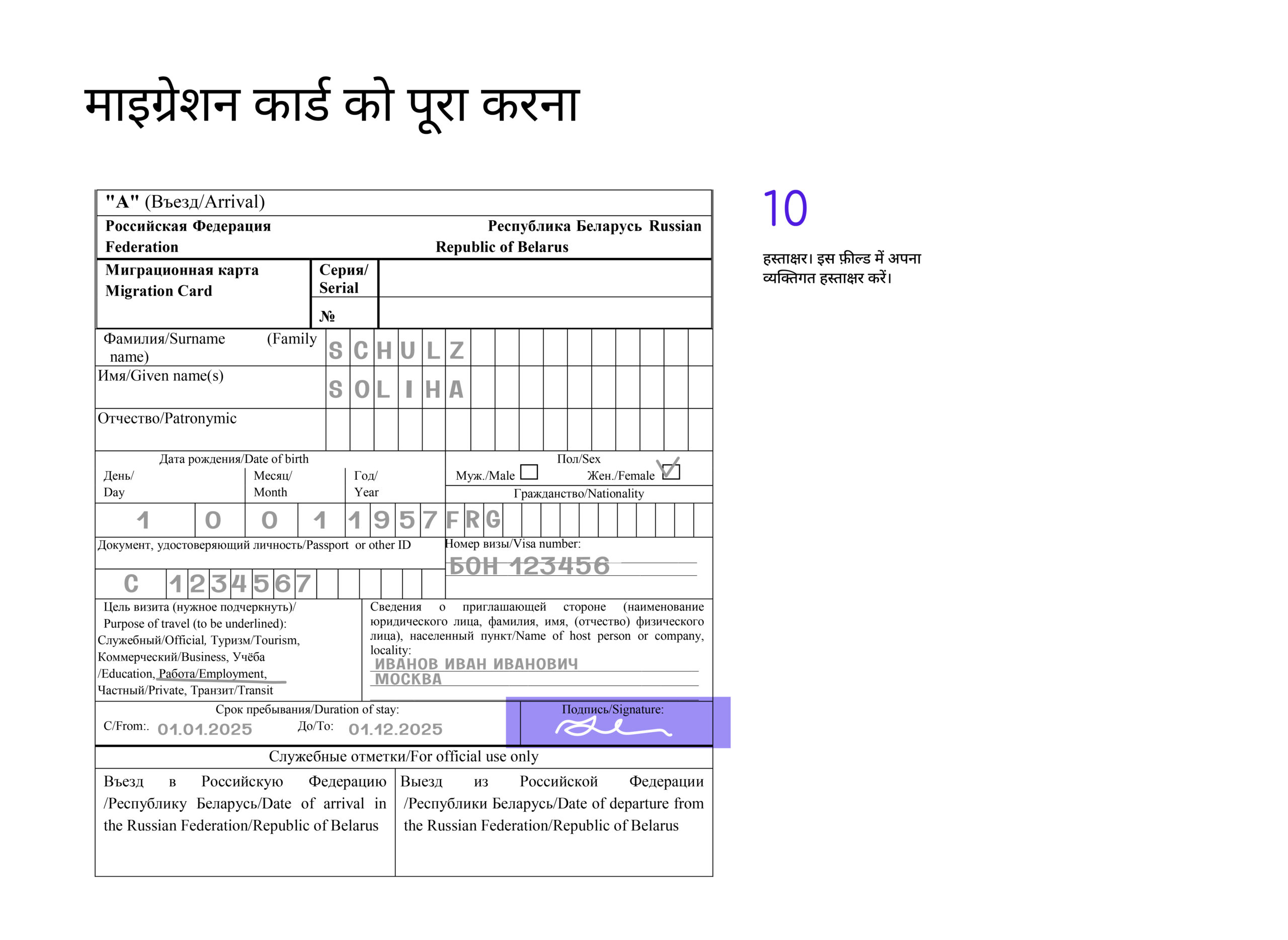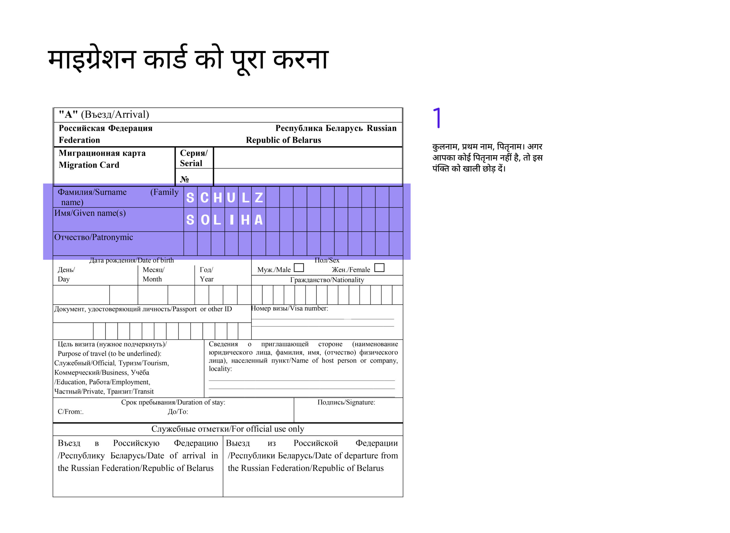 डॉक्युमेंट को रूसी भाषा में भरना बेहतर होता है, लेकिन इसे अंग्रेजी अक्षरों में भी भरा जा सकता है।