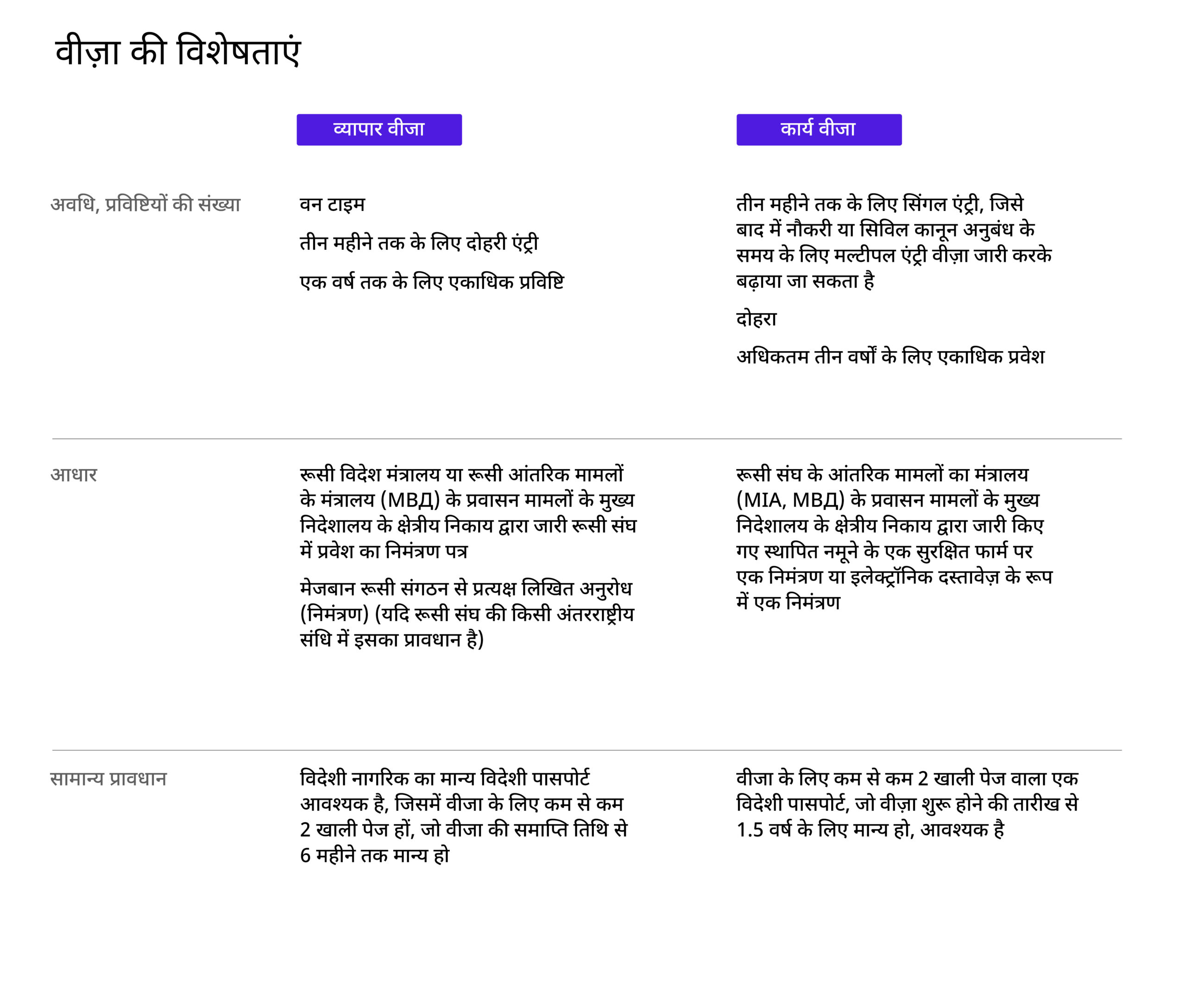 10 से अधिक प्रकार के वीज़ा हैं जिनके तहत विदेशी नागरिकों को रूस में प्रवेश की अनुमति है। इनमें से कुछ सबसे आम वीज़ा व्यवसाय और नौकरी वीज़ा हैं। नीचे दी गई तालिका उनकी मुख्य विशेषताओं का सारांश प्रस्तुत करती है।