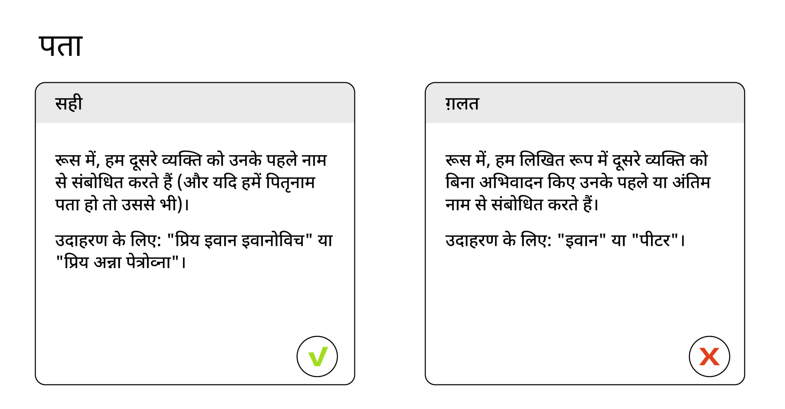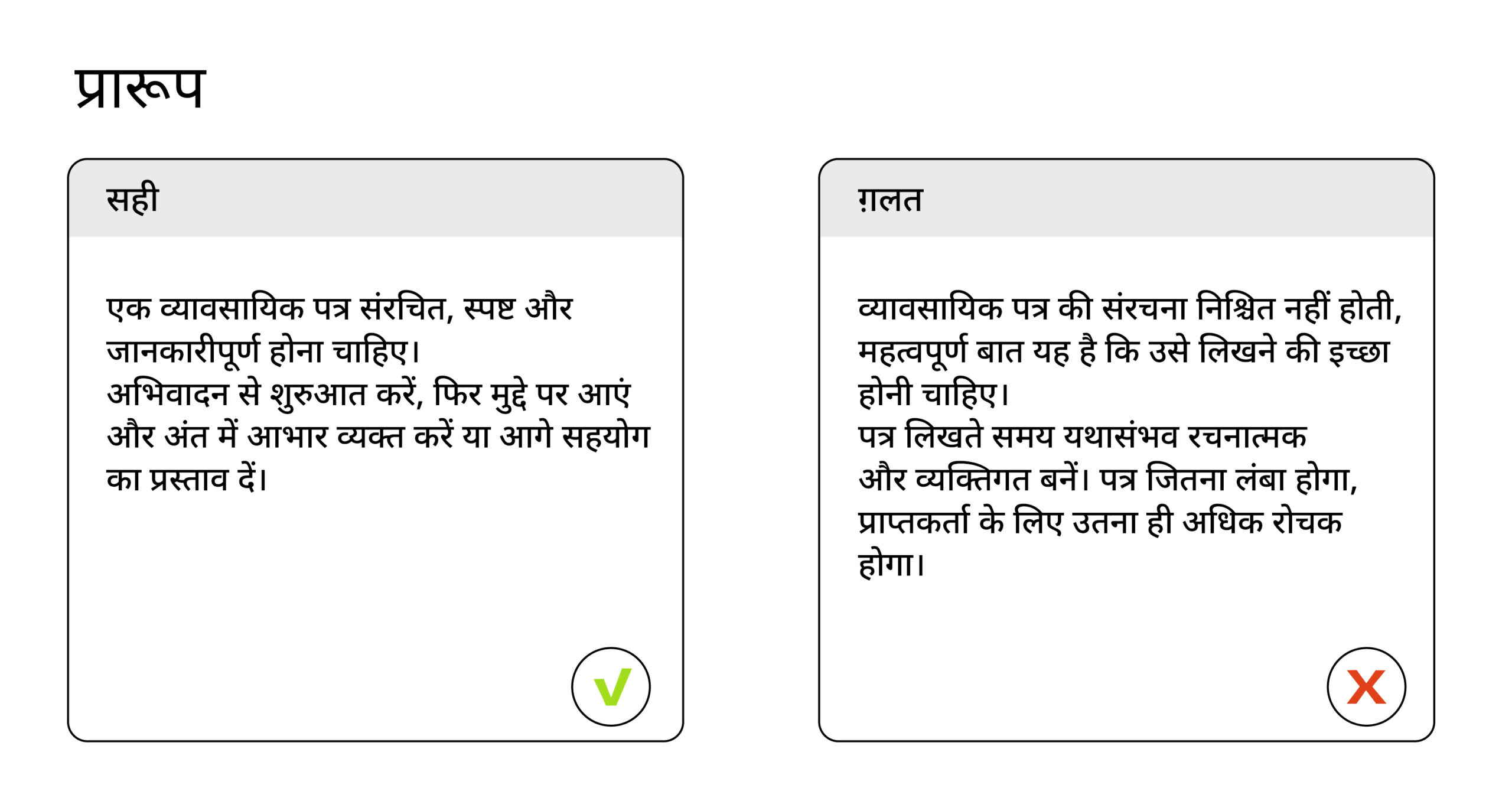 ये सर्वोत्तम प्रेक्टिस नियमित लेटर और ई-मेल दोनों लिखने पर लागू होती हैं। यह अनुशंसा की जाती है कि ई-मेल का उत्तर प्राप्ति के 24 घंटे के भीतर दिया जाए। नियमों और नमूना लेटर पर करीब से नज़र डालने के लिए, यहाँ क्लिक करें।.