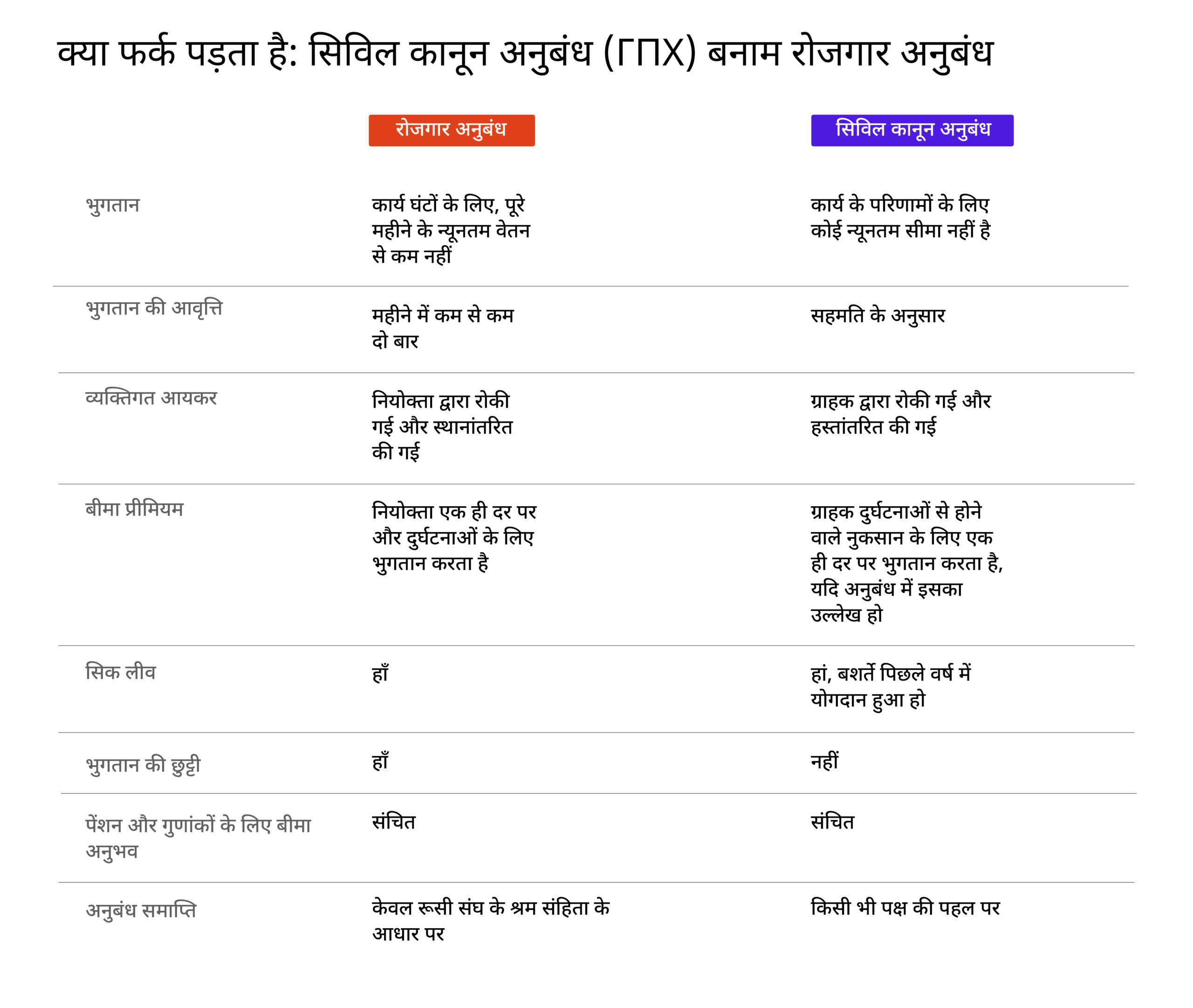 सिविल कानून अनुबंध (ГПХ) के मुकाबले एम्प्लॉयमेंट कॉन्ट्रैक्ट बेहतर है, क्योंकि यह एम्प्लॉई को ज़्यादा गारंटी और सुरक्षा देता है। सवेतन अवकाश और सिक लीव, व्यावसायिक स्वास्थ्य सुरक्षा इसके कुछेक लाभ हैं।