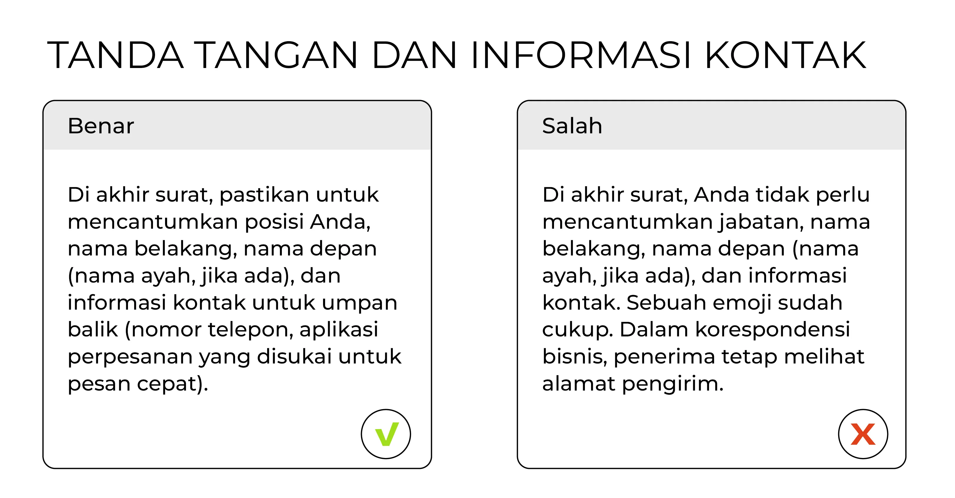 Praktik terbaik ini berlaku untuk menulis surat biasa dan email. Sebaiknya email ditanggapi dalam waktu 24 jam setelah diterima. Untuk mempelajari lebih lanjut terkait aturan dan contoh surat, klik di sini..