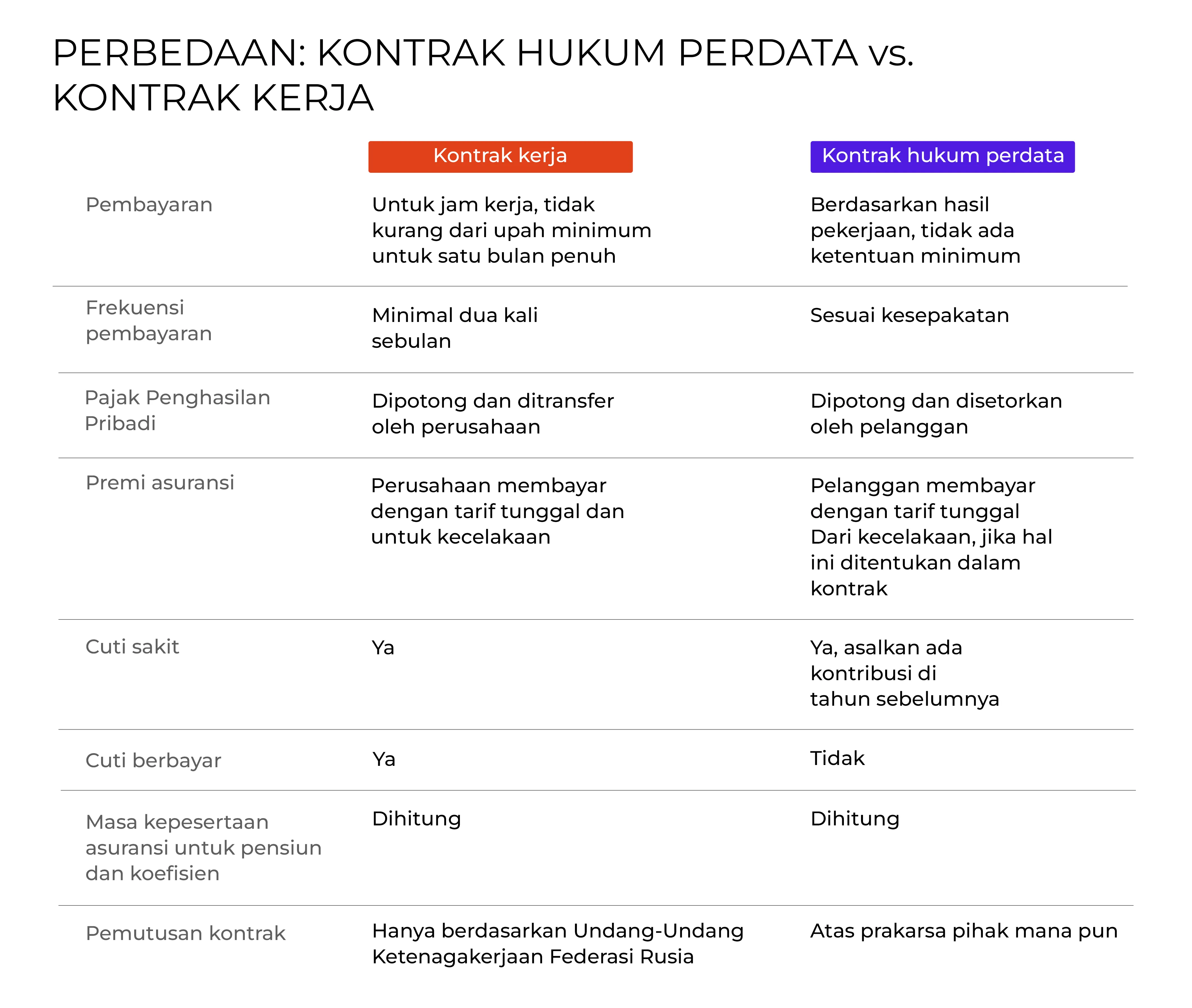 Kontrak hukum perdata berbeda dari kontrak kerja biasa karena tidak mencantumkan sejumlah persyaratan penting (lihat tabel). Hal ini perlu diperhatikan.