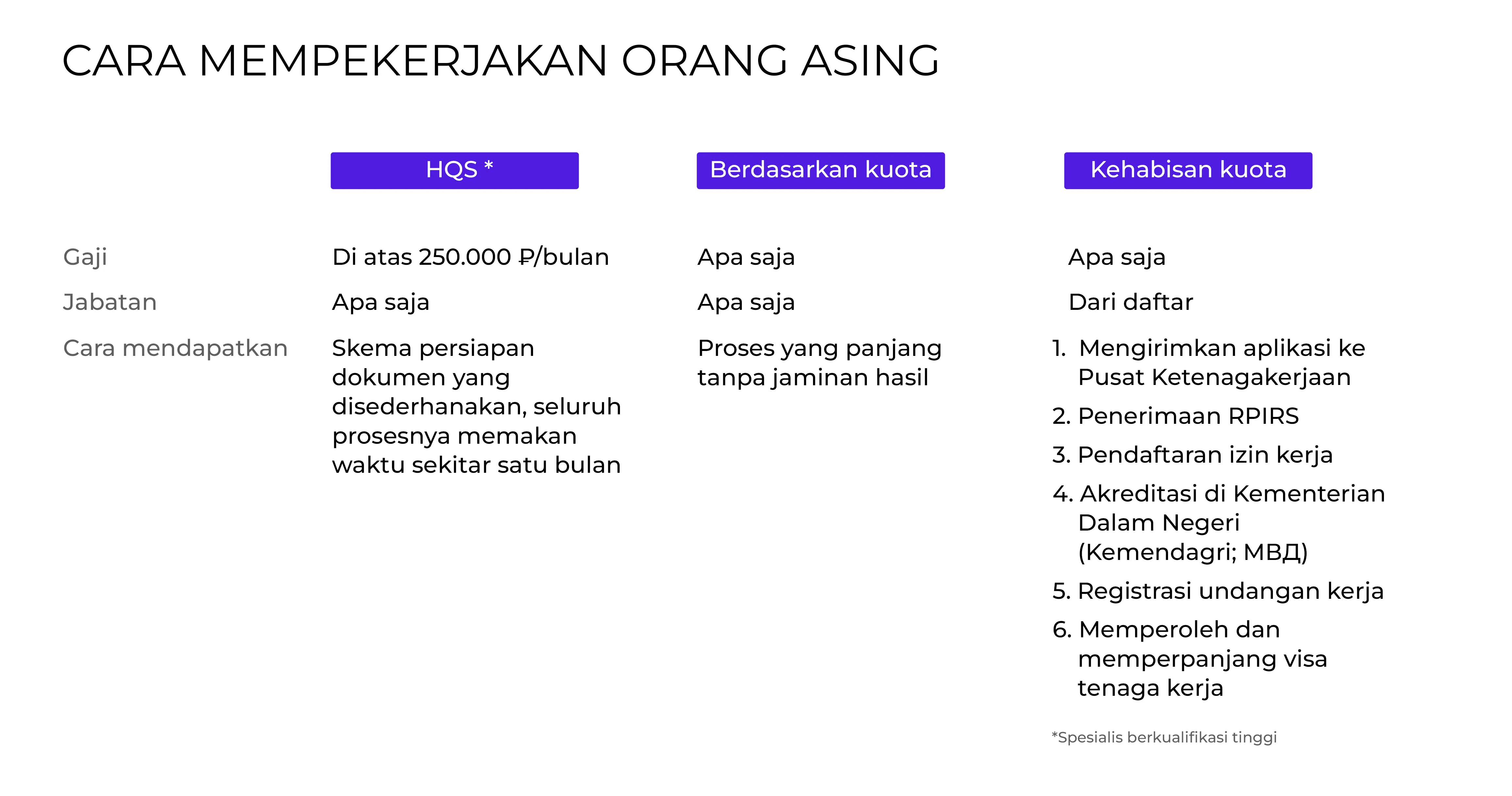 Cocok untuk personel yang berkualifikasi tinggi. Masa kerja hingga 3 tahun, dan gaji sebelum pajak mulai dari 3 juta rubel per tahun. Kontrak kerja atau kontrak hukum perdata akan disepakati dengan Anda. Harap perhatikan pengecualiannya. Anda tidak boleh bekerja untuk pengusaha perorangan, dalam organisasi spiritual (agama dan pendidikan), organisasi prasekolah (taman kanak-kanak, tempat penitipan anak, kelompok anak-anak yang tinggal secara terbatas) dan pendidikan sekolah. Anda akan memerlukan visa kerja dan izin kerja.