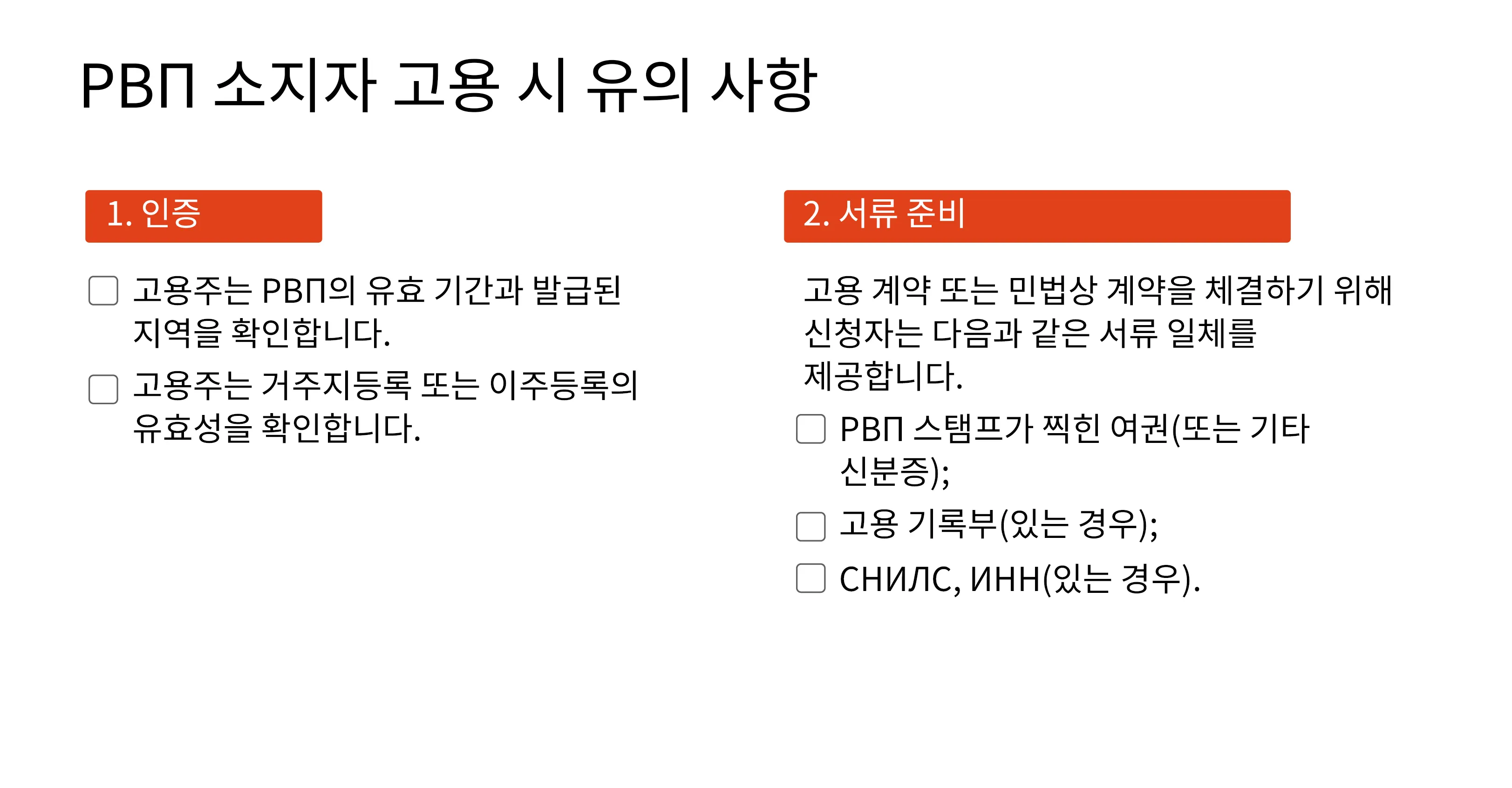 벨라루스, 카자흐스탄, 아르메니아 또는 키르기스스탄 출신인 경우 고용 절차는 다른 러시아인과 동일합니다. 이주카드, 임시 거주 허가(РВП) 또는 영주권(ВНЖ)을 제시해야 합니다. 벨라루스 공화국 시민은 벨라루스 여권만 제시하면 됩니다.