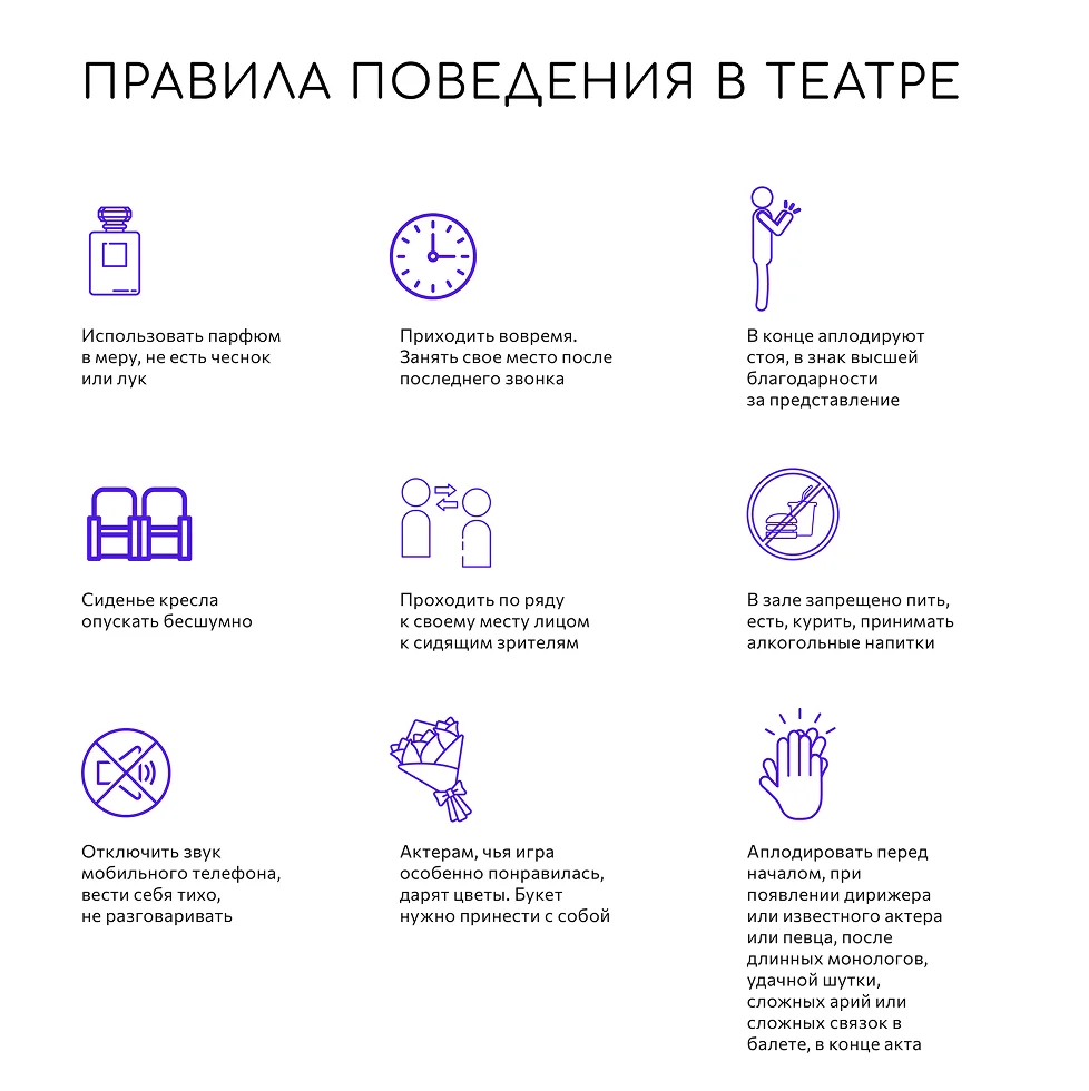 - Следует отказаться от блюд с луком и чесноком, а также от нанесения большого количества духов перед посещением театра.