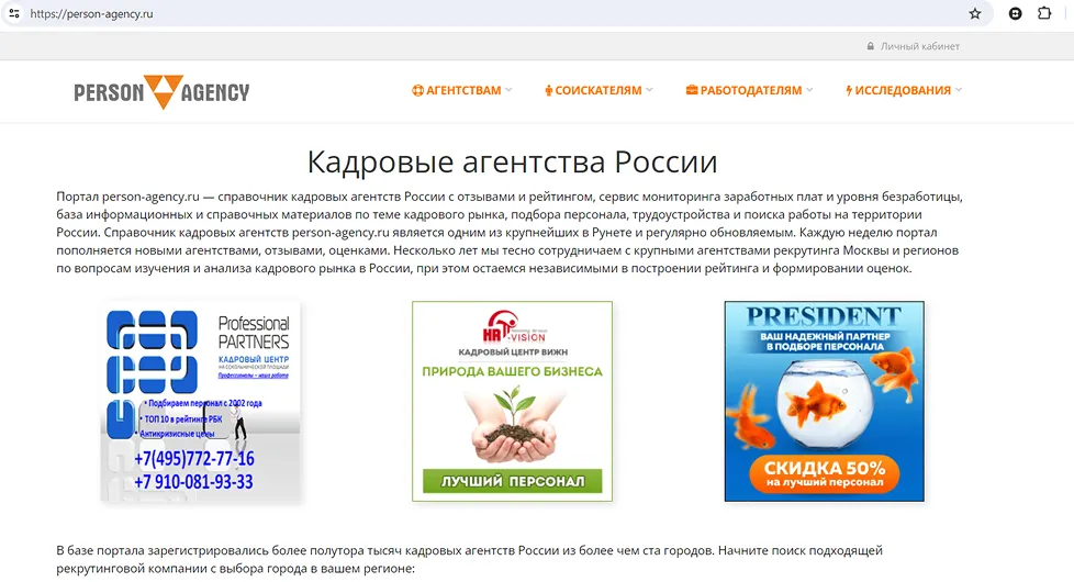 При обращении в агентство ваши навыки и опыт тщательно оценят, чтобы определить вакансии, которые наилучшим образом соответствуют вашим способностям. Затем вас свяжут с работодателем. Обратите внимание на необходимость оплатить услуги агентства. Чтобы выбрать компанию с хорошей репутацией, обратитесь на онлайн-портал, где собраны вакансии ключевых агентств России.