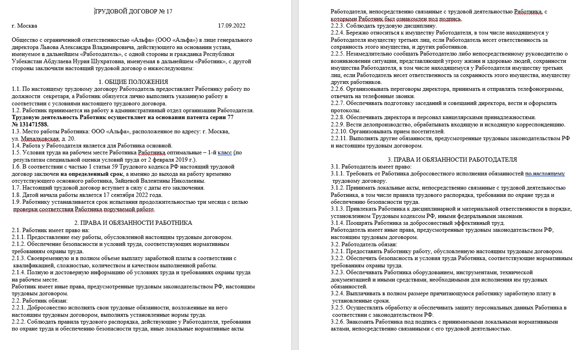 В договоре указывают: фамилию, имя (отчество, при наличии) работника и наименование работодателя, место и дату заключения договора, место работы, трудовую функцию, дату начала работы. В случае заключения срочного трудового договора указывают срок его действия, оплату (размер тарифной ставки или должностного оклада, доплаты, надбавки, поощрительные выплаты), рабочее время и время отдыха, особый характер работы (например, разъездной), условия труда на рабочем месте, гарантии и компенсации, персональные данные.