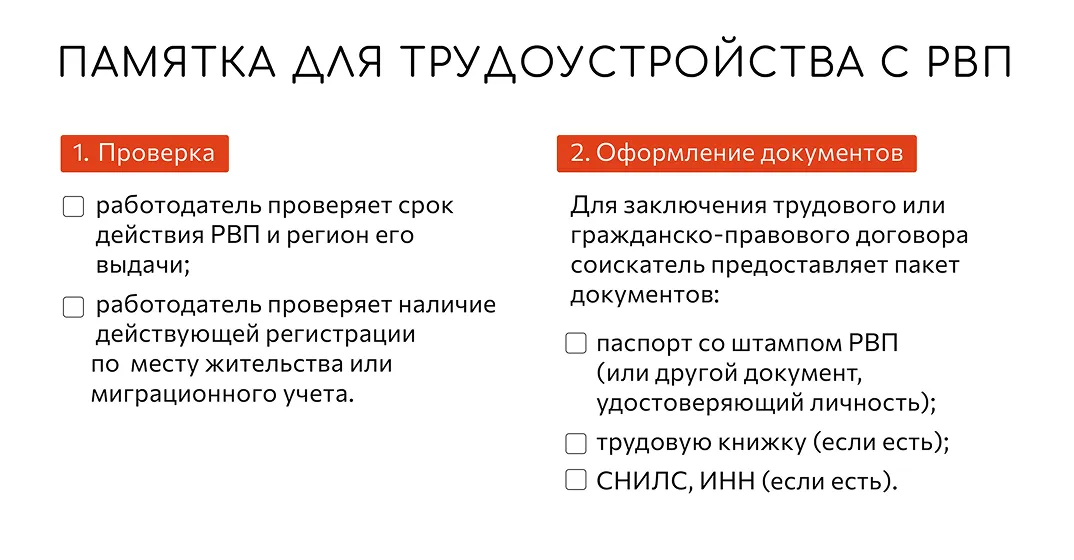 Если вы приехали из Беларуси, Казахстана, Армении или Киргизии, процедура трудоустройства будет такой же, как у любого россиянина. Нужно будет предъявить миграционную карту, разрешение на временное пребывание (РВП) или вид на жительство (ВНЖ). Гражданину Республики Беларусь достаточно предъявить свой белорусский паспорт.