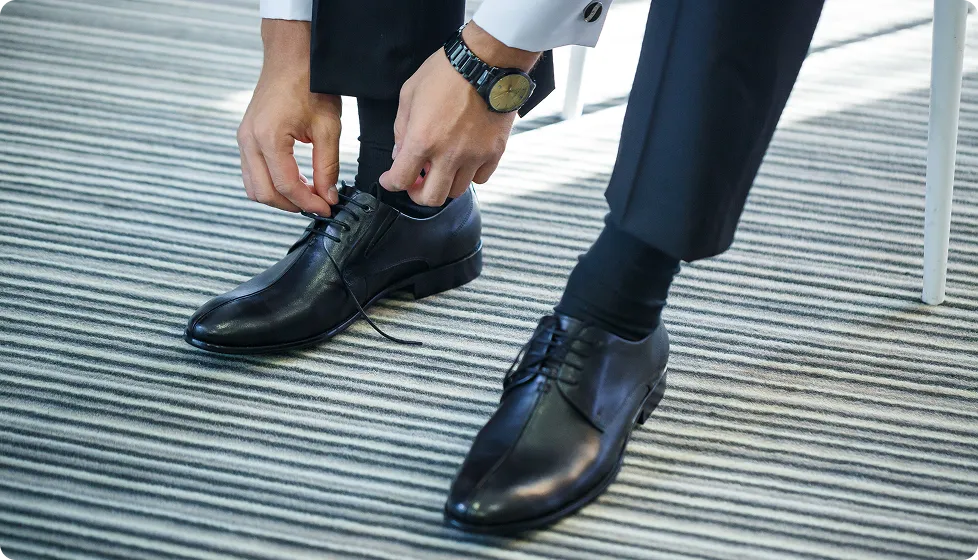 Обувь должна быть чистой и аккуратной. Часто используется классический черный или коричневый цвет. Носки должны быть одного цвета с брюками и обувью.