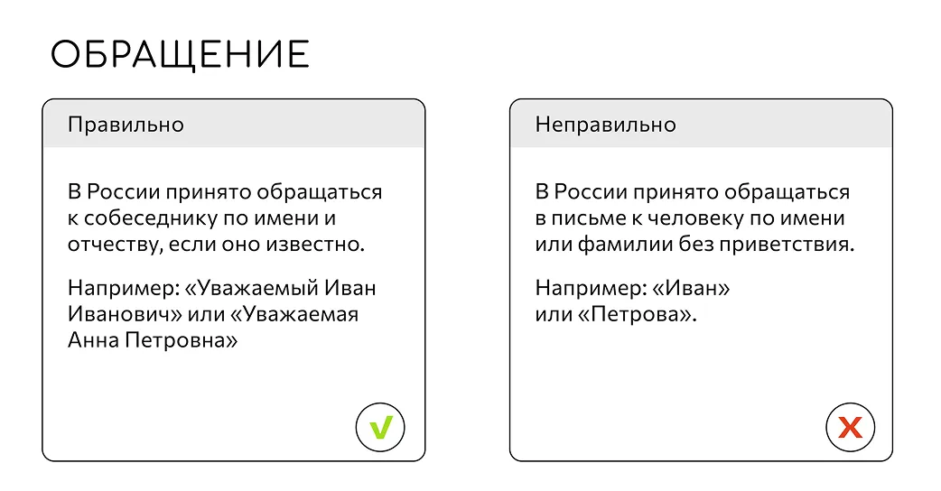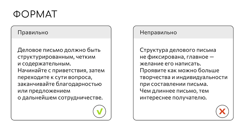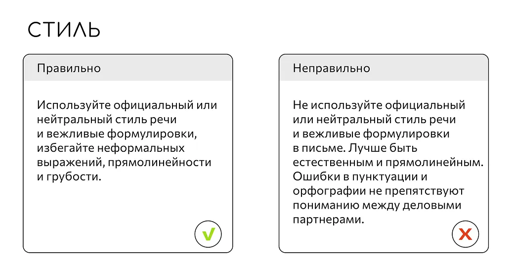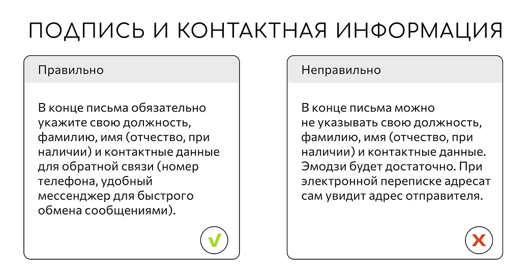 Правила относятся к написанию обычных и электронных писем. На электронные письма рекомендуется отвечать в течение суток с момента получения. Детально изучить правила и примеры писем можно здесь.