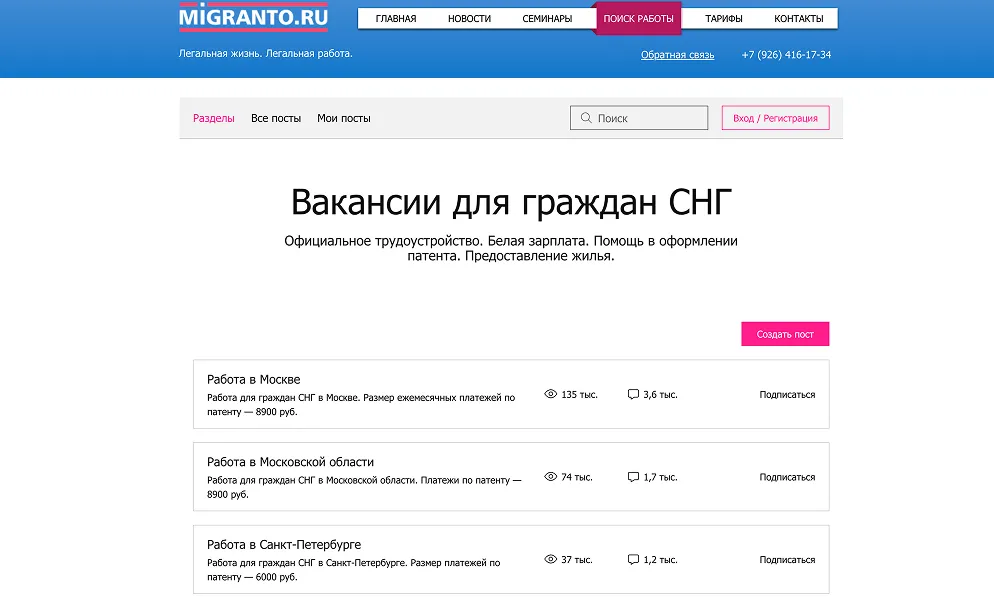 ПерейтиДанный портал является общероссийской информационно-образовательной рекрутинговой площадкой для иностранных граждан из стран СНГ. Он содействует трудоустройству мигрантов. Эксперты проводят онлайн-семинары по миграционному законодательству. На форуме для работодателей и соискателей можно задать вопросы сотрудникам кадровых и визовых служб.