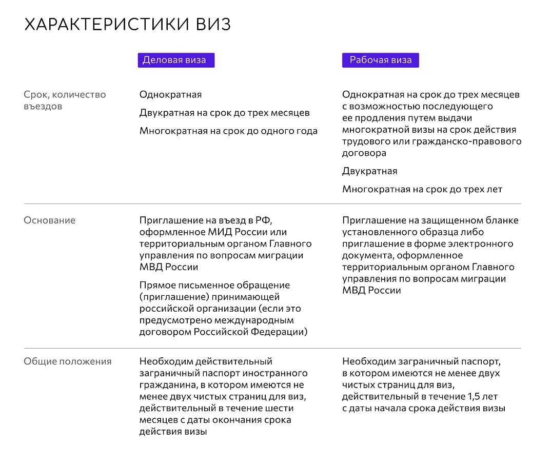 Существует более десяти видов виз, по которым иностранным гражданам разрешен въезд в Россию. Одними из самых распространенных являются деловая и рабочая визы. В таблице приведены их основные характеристики.