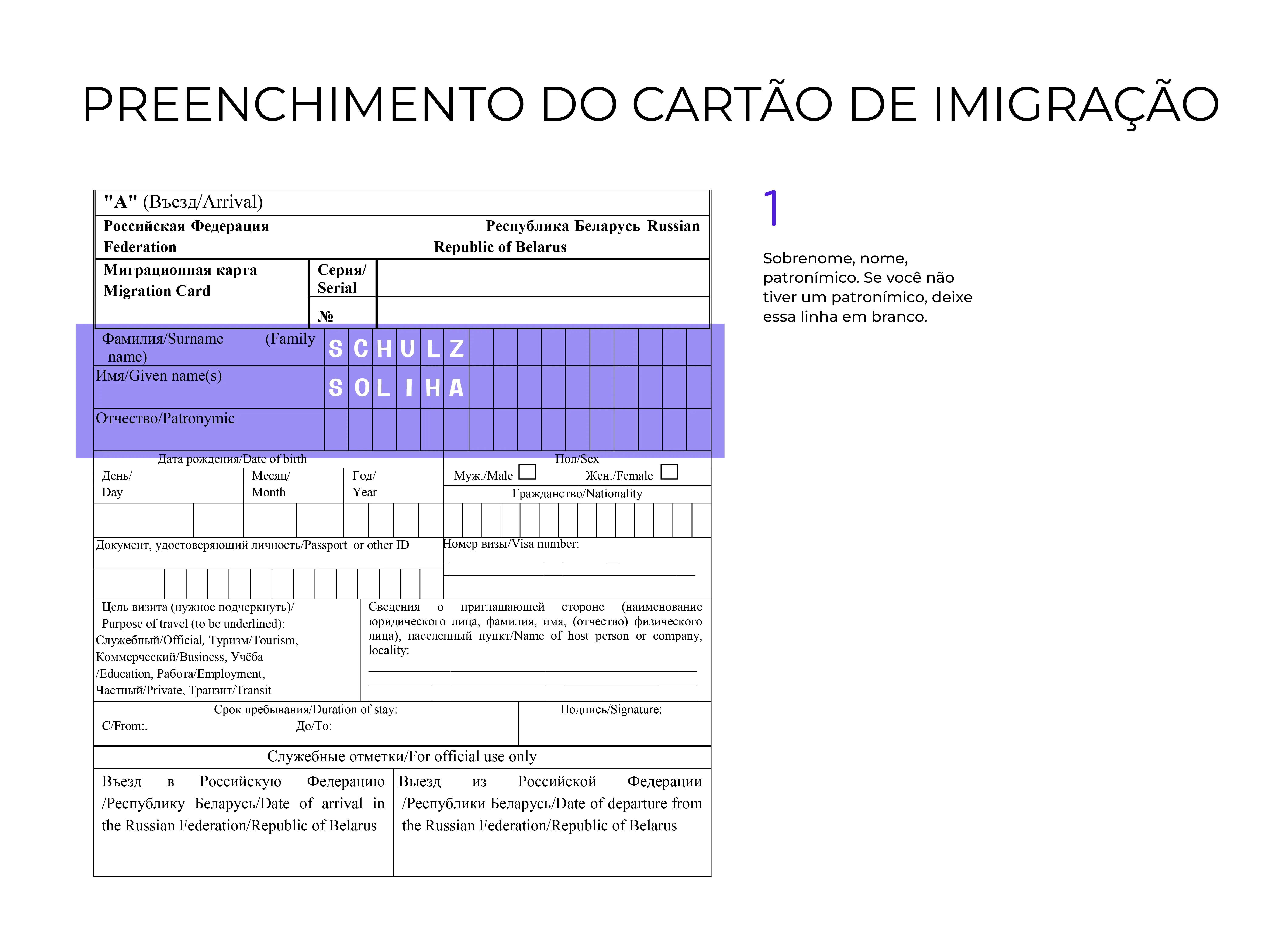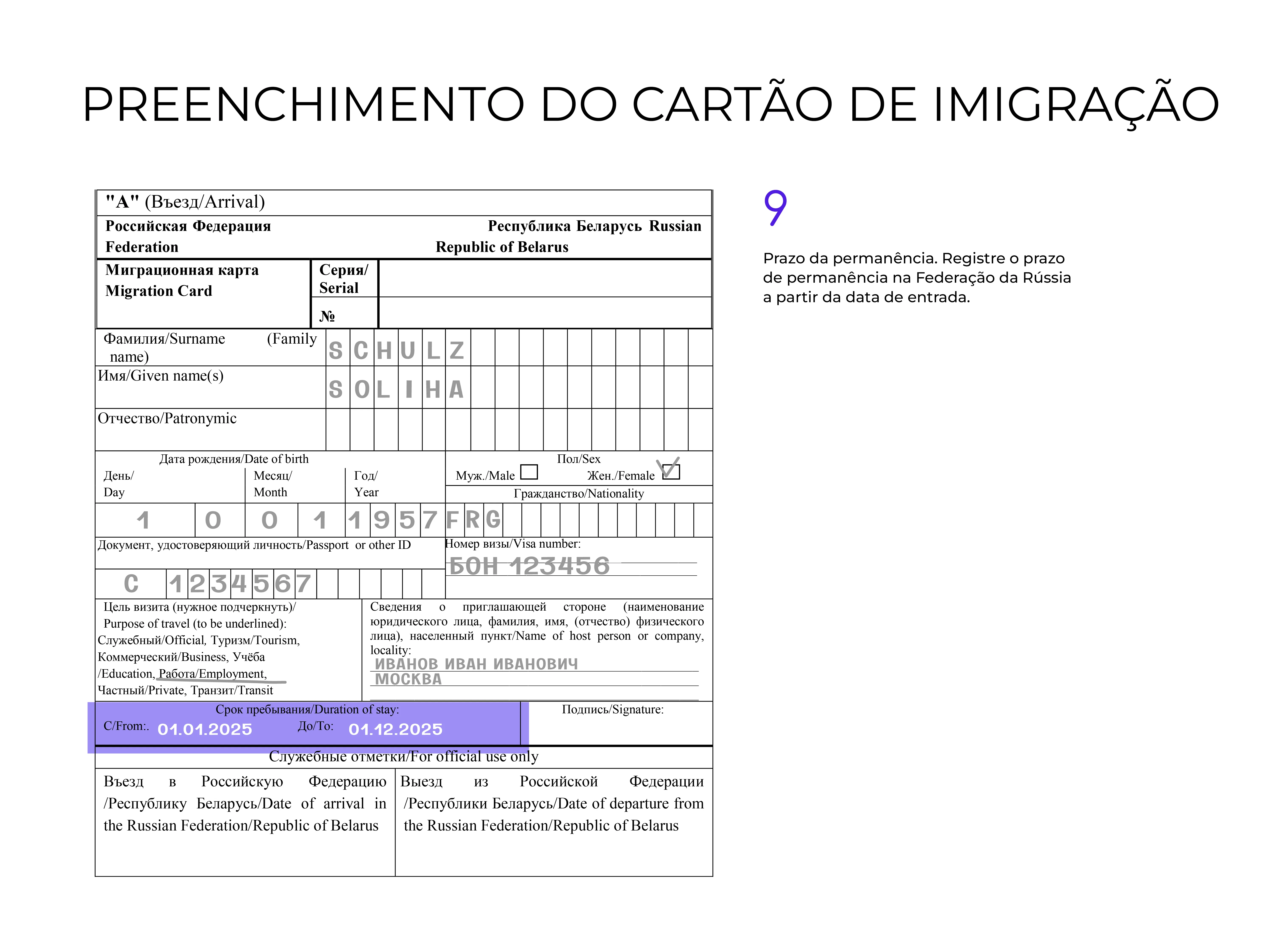 - Preencha um cartão de imigração ao entrar e entregue-o a um funcionário ao sair do território da Federação da Rússia.