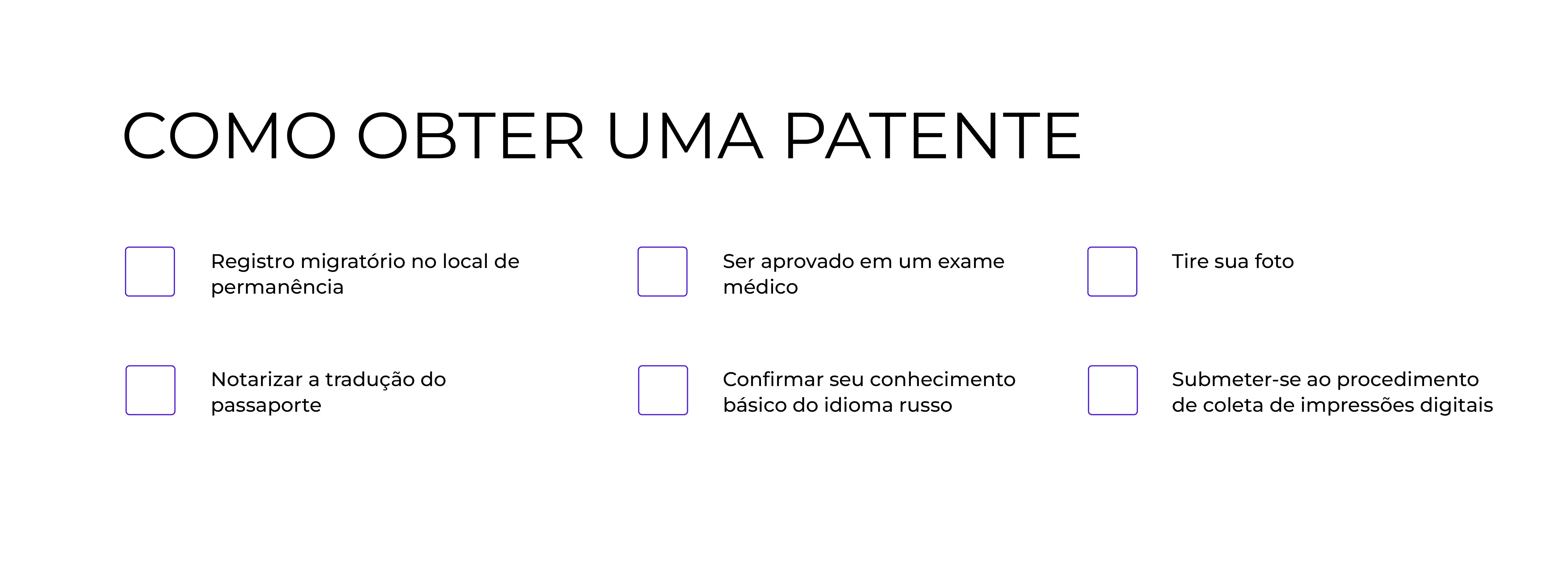 Para obter uma patente, é necessário passar pelo registro migratório no local de permanência, fazer uma tradução juramentada do passaporte, passar por um exame médico, confirmar o conhecimento básico do idioma russo, tirar uma foto e passar por um procedimento de dactiloscopia. Tanto a patente quanto a autorização de trabalho são emitidas nas unidades de migração do Ministério do Interior (МВД).