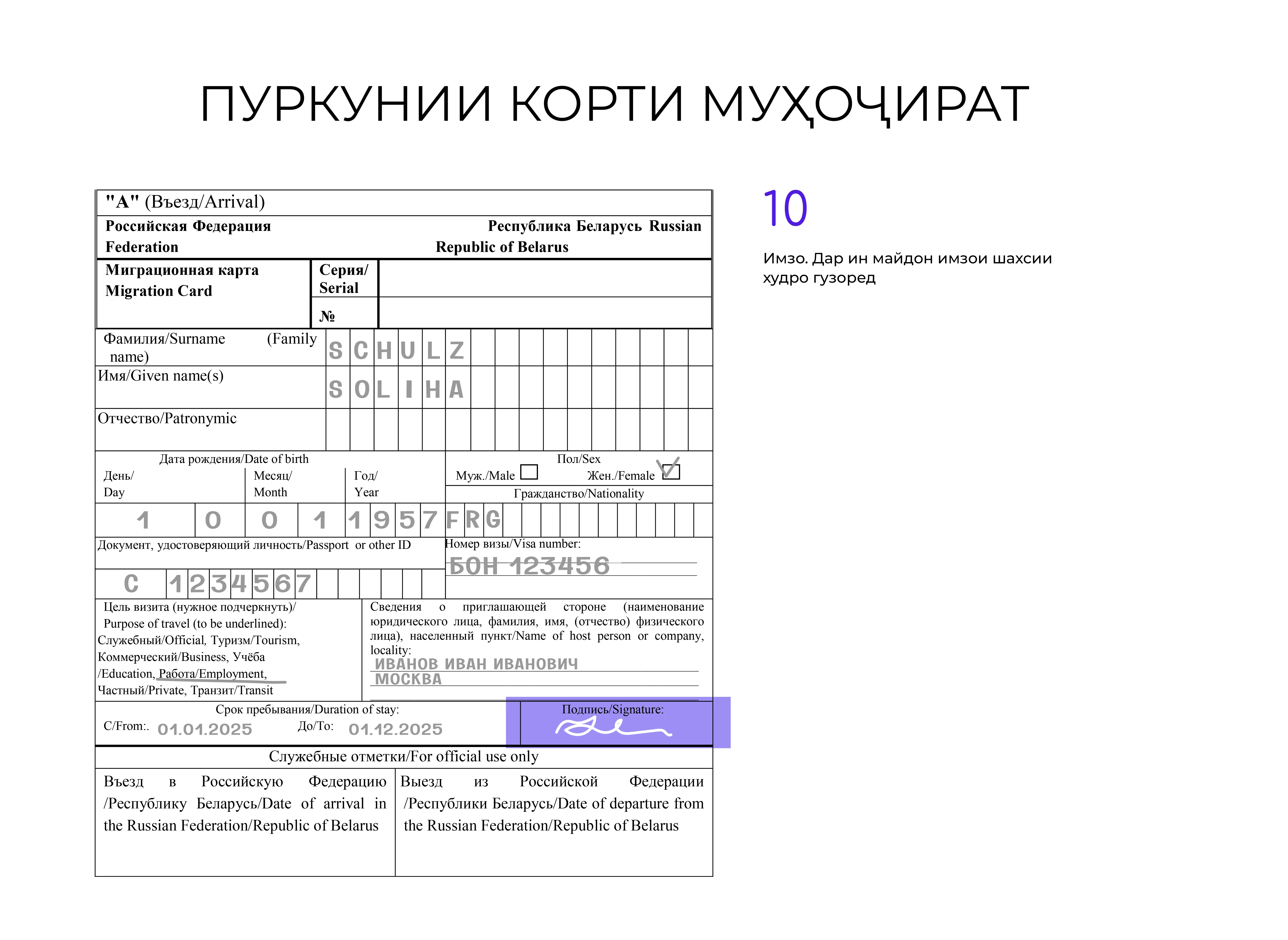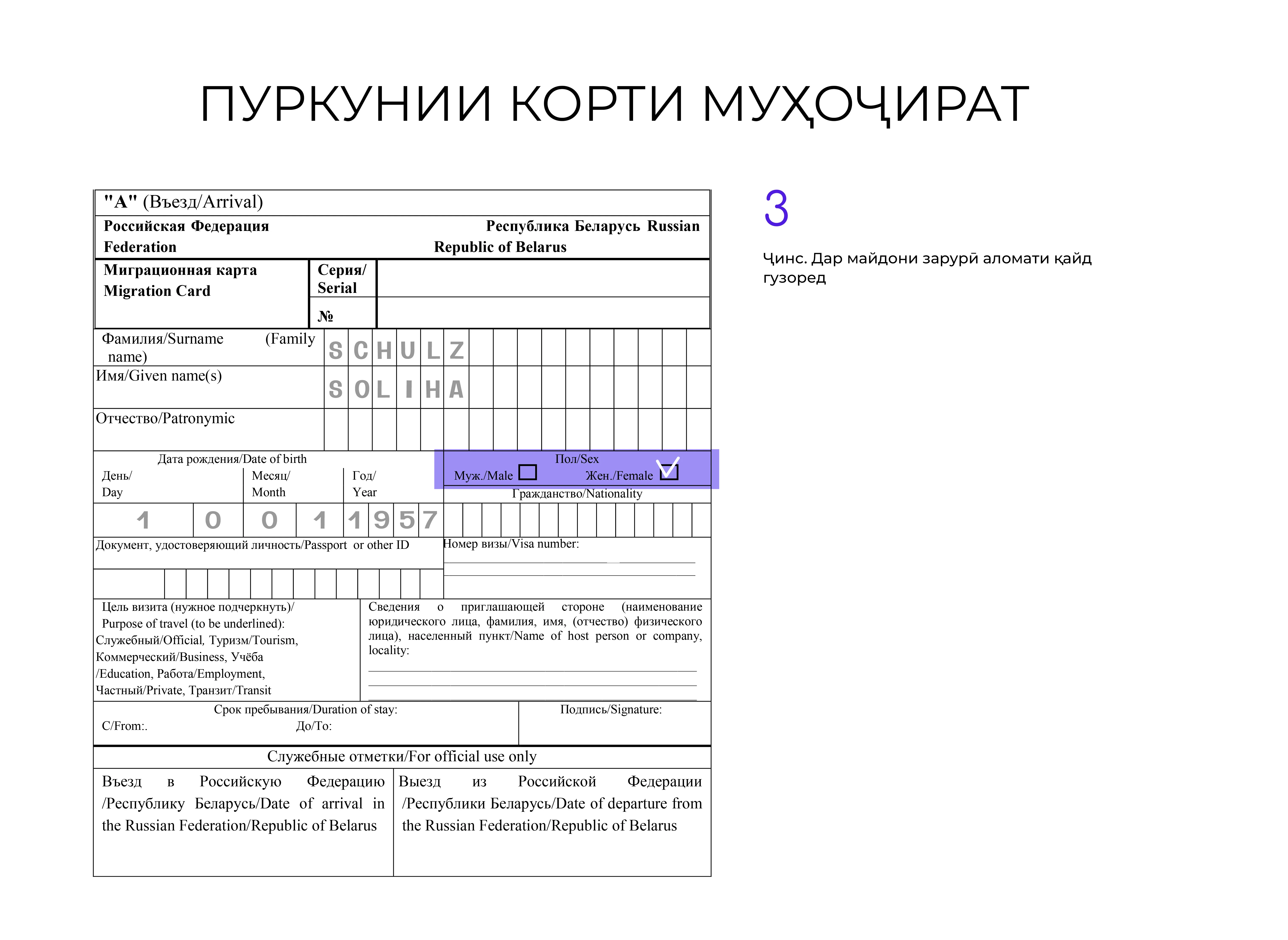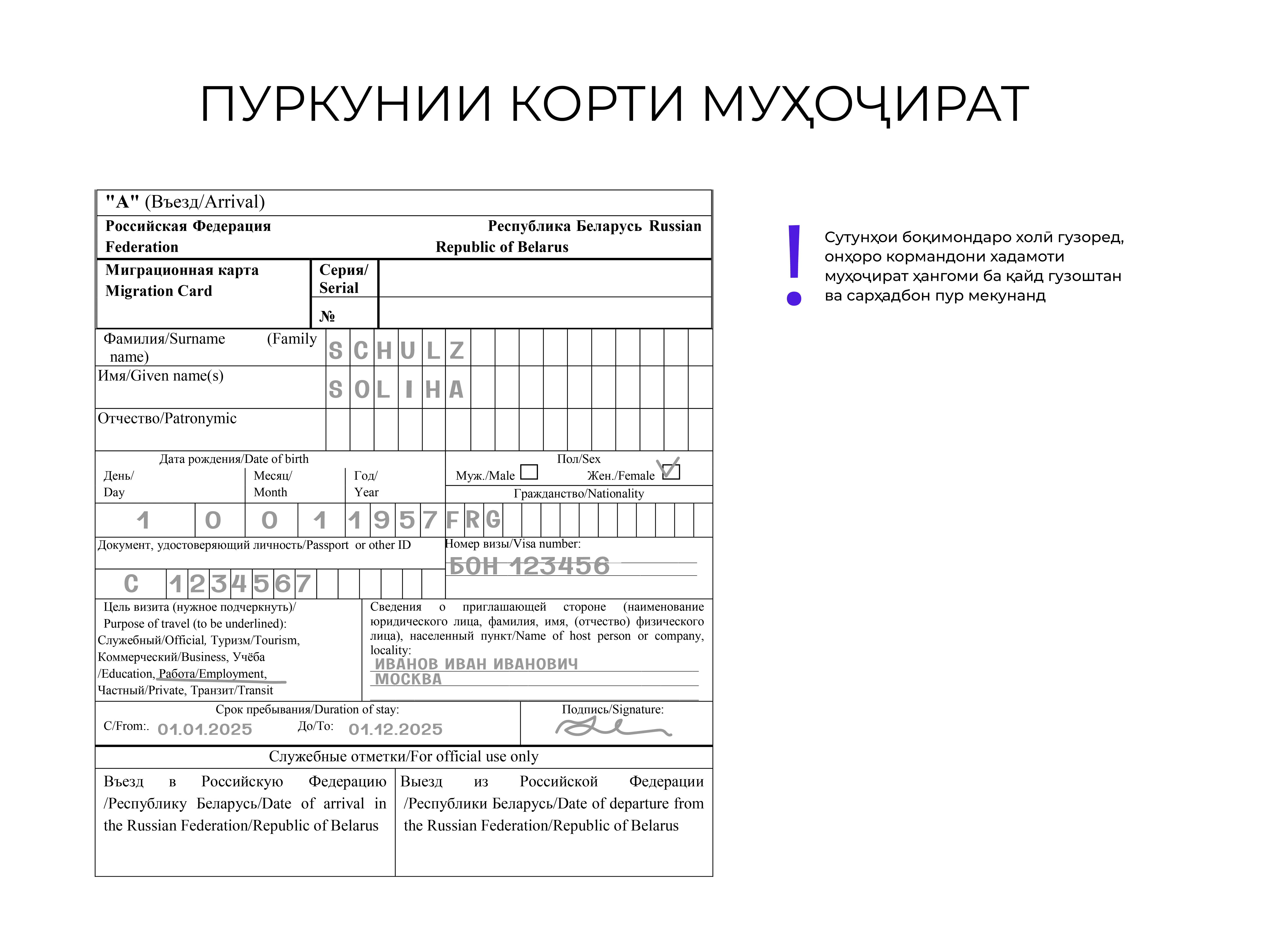 - Ҳангоми вуруд корти муҳоҷиратиро пур кардан ва ҳангоми баромадан аз ҳудуди ФР ба шахси мансабдор супоридан.