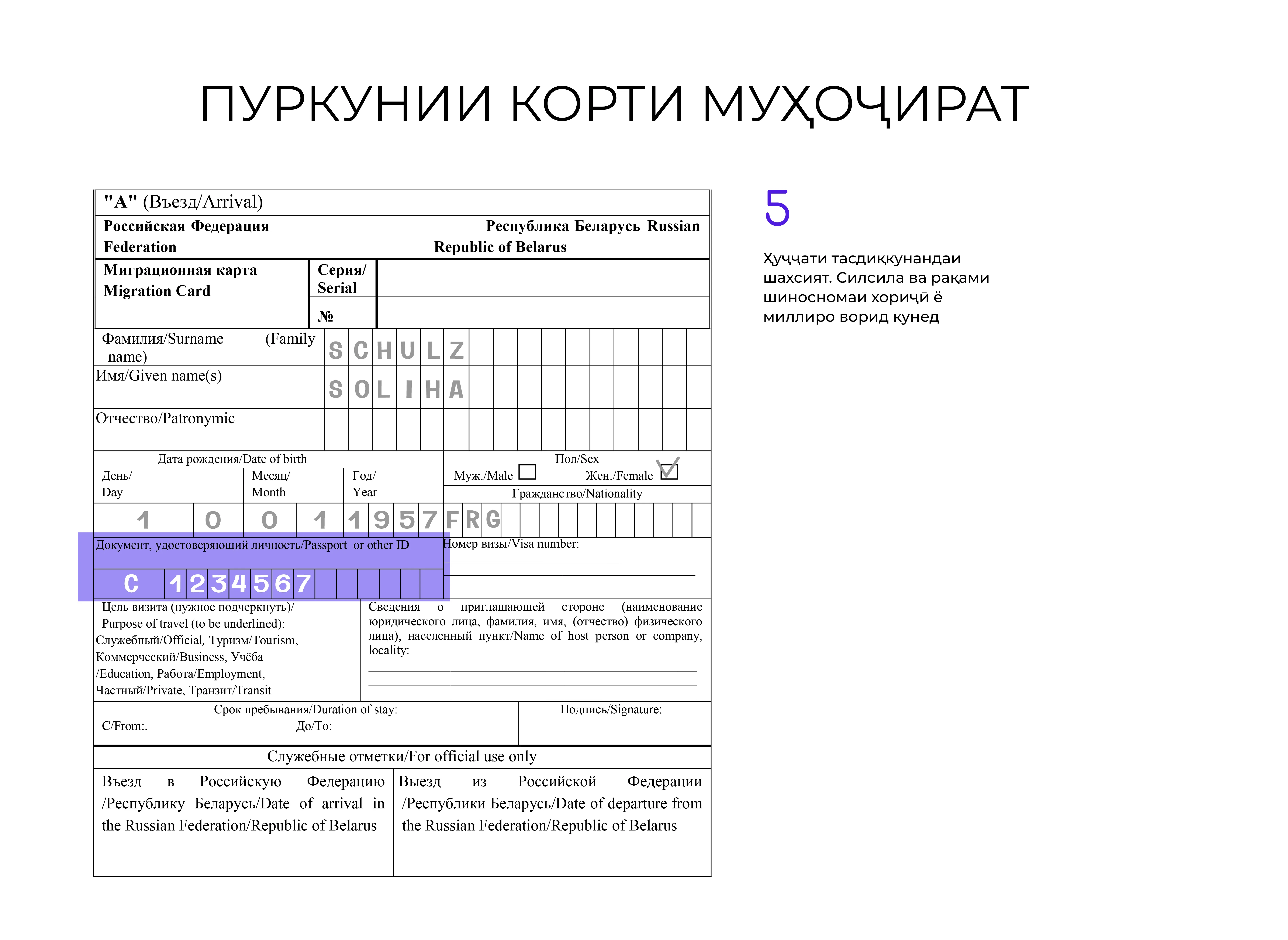 Ҳангоми вуруд ба ФР варақаи корти муҳоҷиратиро бояд аз корманди хадамоти сарҳадӣ дар назорати шиносномавӣ гирифт.