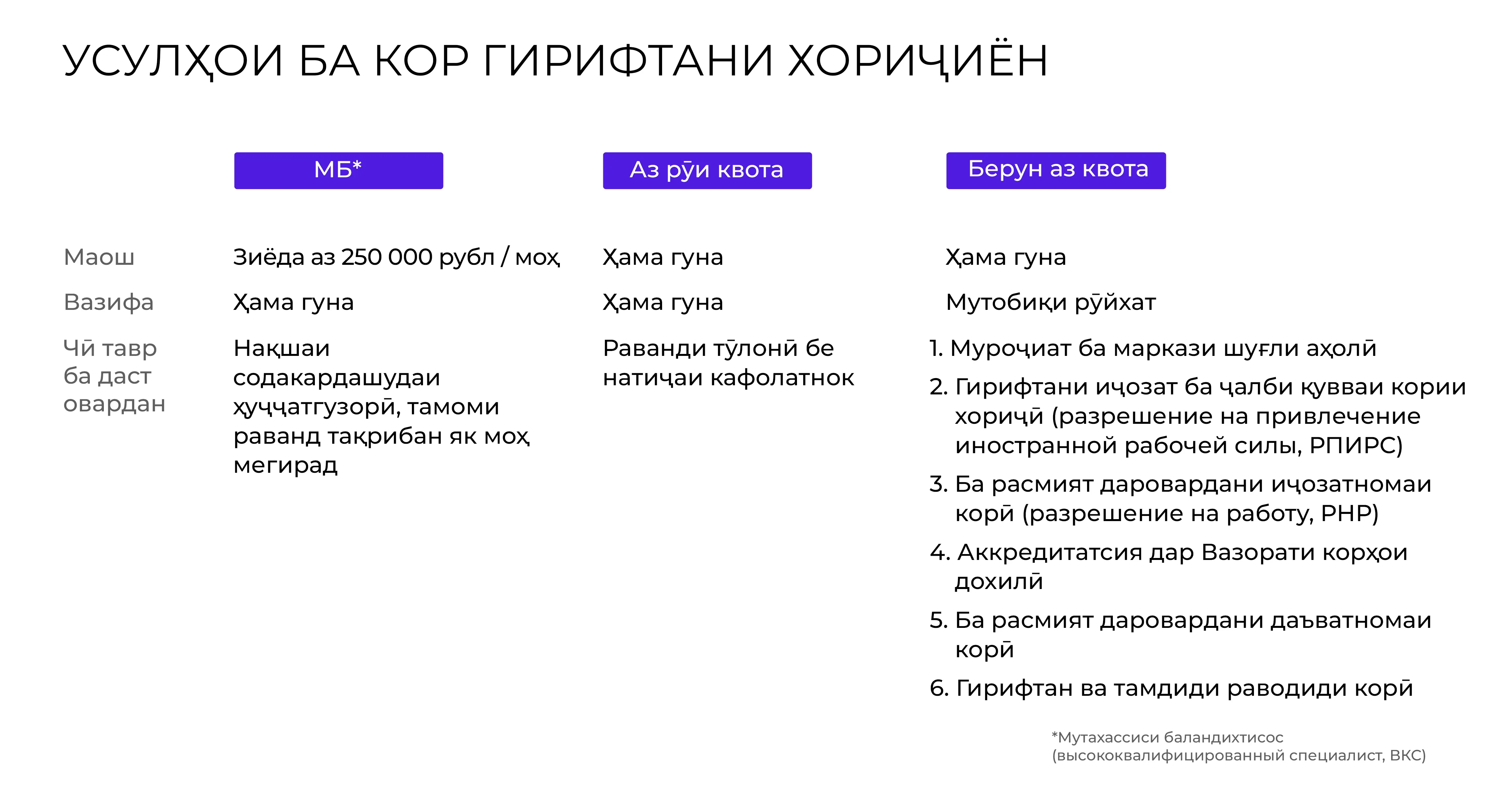 Барои кормандони баландихтисос муносиб аст. Муҳлати кор то се сол, маоши пеш аз андоз аз 3 миллион рубл дар як сол. Бо шумо шартномаи меҳнатӣ ё шартномаи гражданӣ-ҳуқуқӣ (ГПХ) баста мешавад. Лутфан истисноҳоро ба назар гиред. Шумо наметавонед дар назди соҳибкорони инфиродӣ (ИП), дар ташкилотҳои рӯҳонӣ (динӣ ва таълимӣ), муассисаҳои томактабӣ (боғчаҳо, кӯдакистон, гурӯҳҳои будубоши муваққатии кӯдакон) ва муассисаҳои таълимии мактабӣ кор кунед. Ба шумо раводиди корӣ ва иҷозати кор лозим мешаванд.