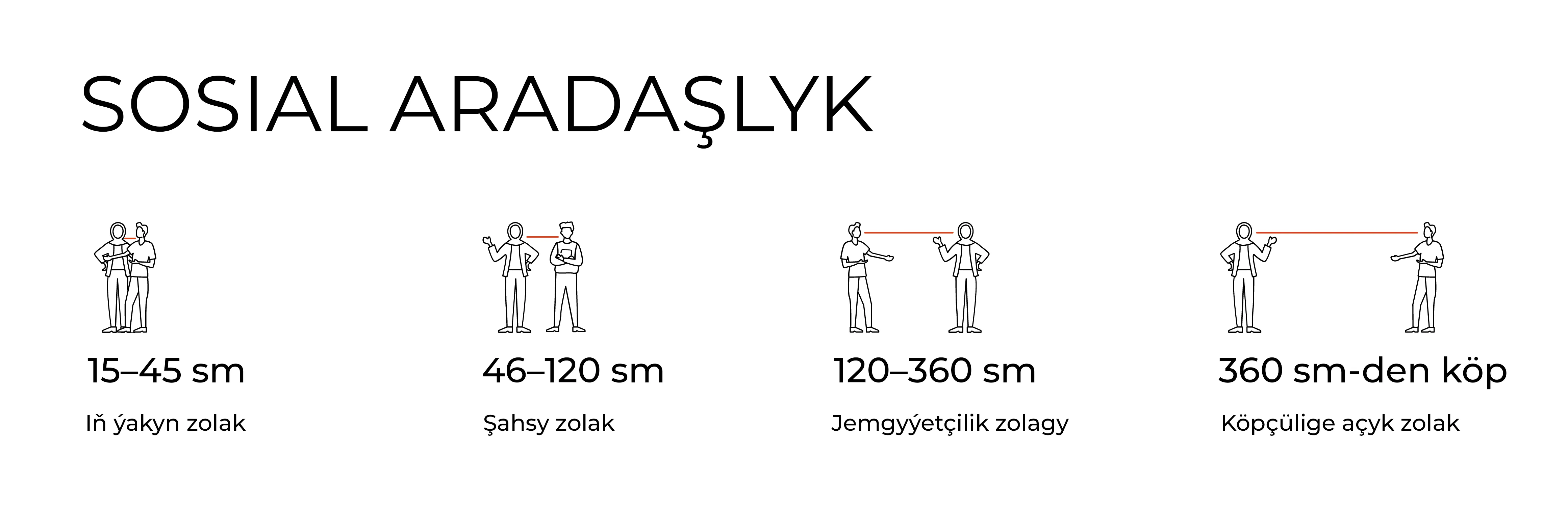 Ýakyn aradaşlyk biziň üçin iň goralýan ýerdir. Oňa diňe iň ýakyn adamlar: çagalarymyz, ene-atalarymyz we söýgülilerimiz girip bilýär. Şahsy zolak dostlar we tanyşlar bilen gündelik aragatnaşykda ulanylýan aradaşlygy aňladýar.