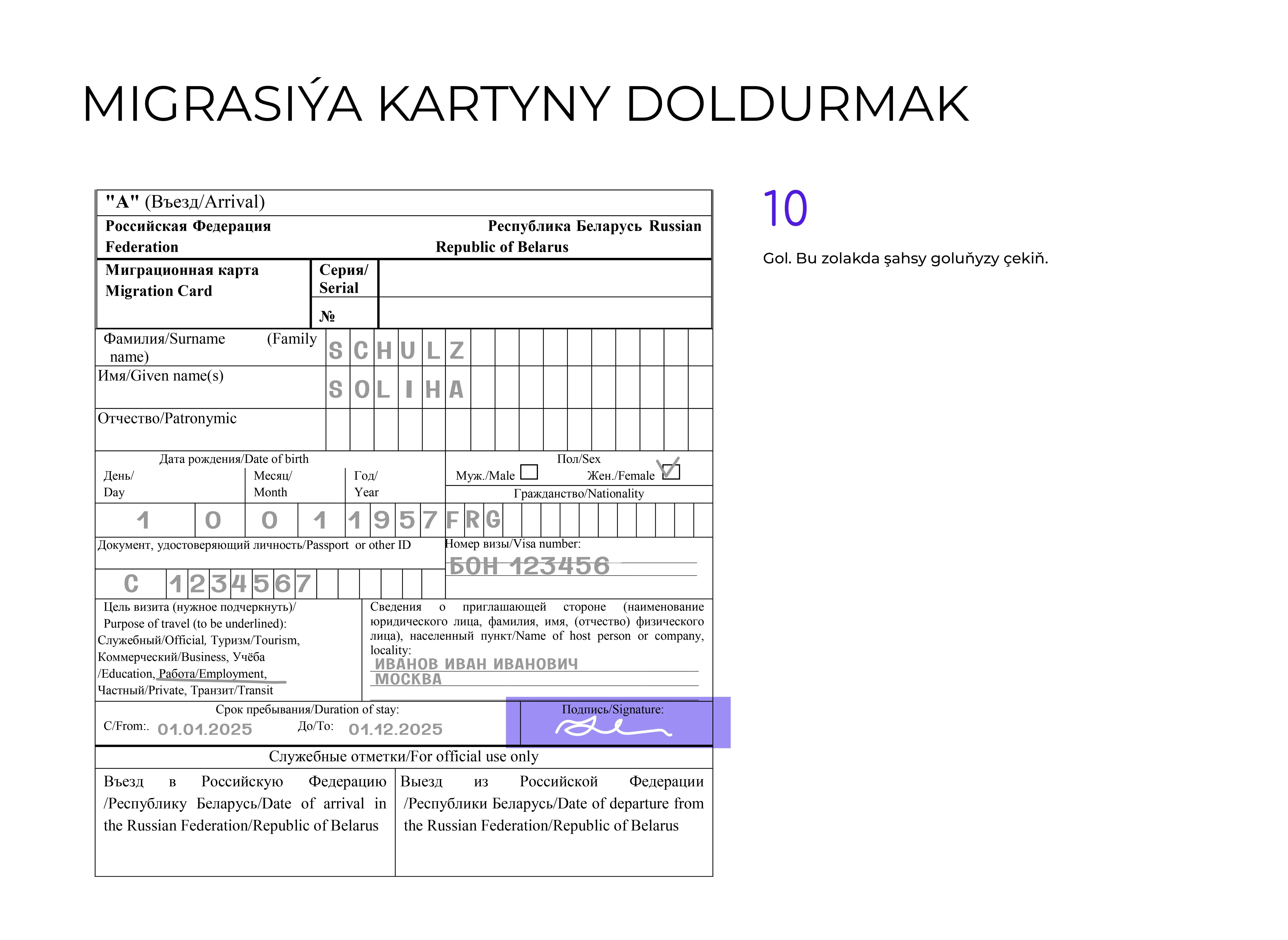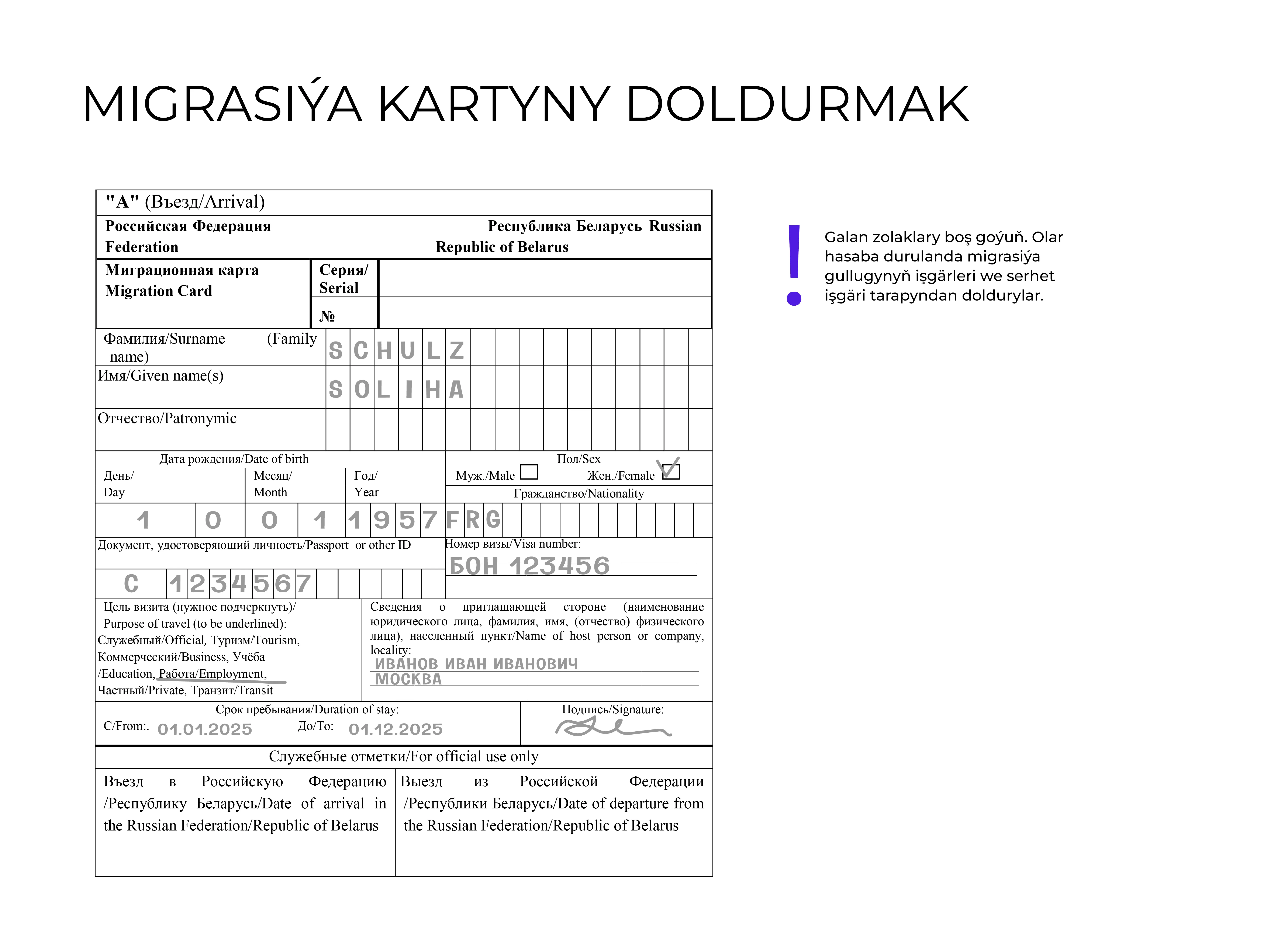 - Ýurduň çägine gireniňizde migrasiýa kartyny dolduryň we Russiýa Federasiýasynyň çäginden çykanyňyzda ony wezipeli adama tabşyryň.