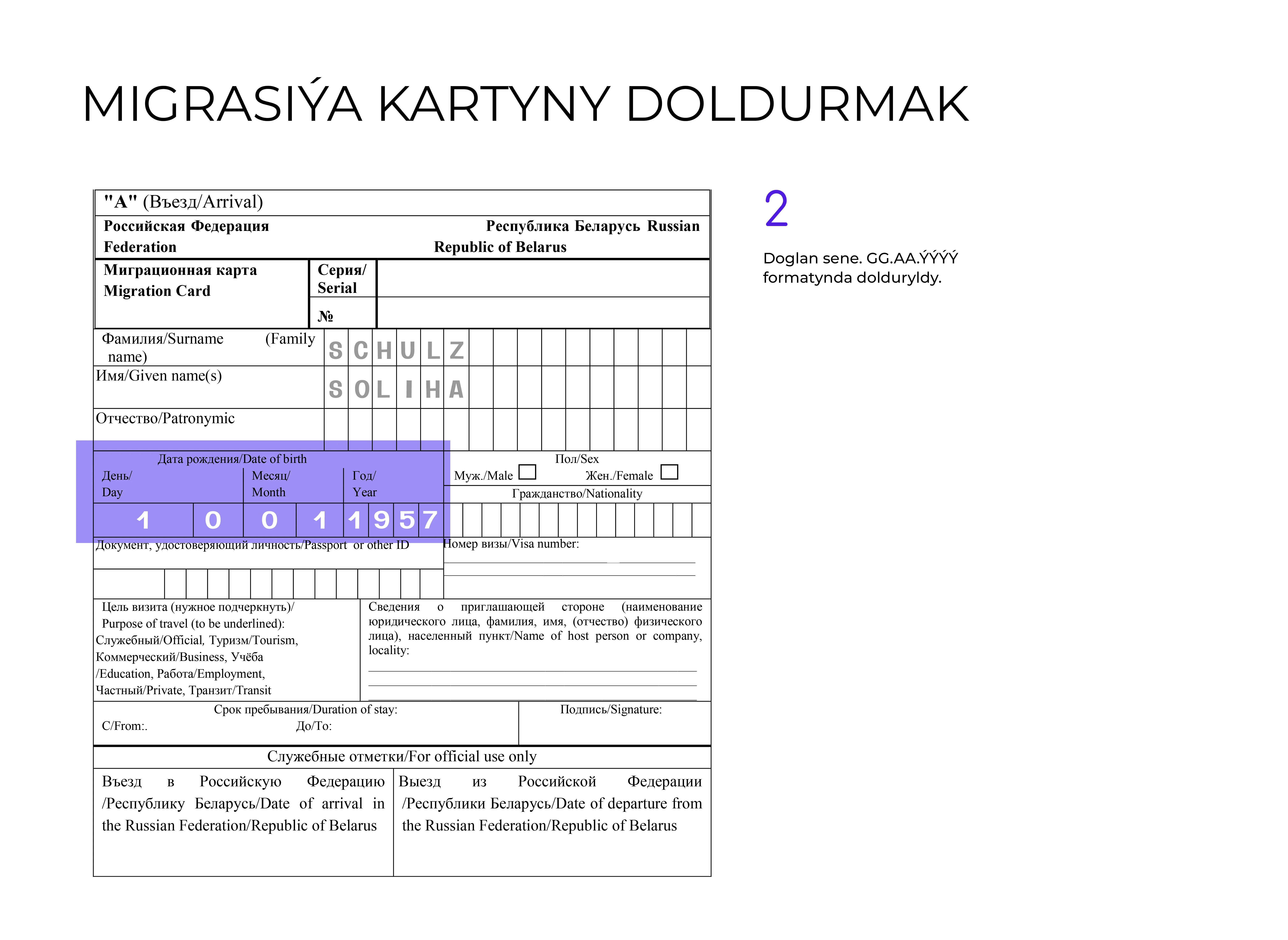 Migrasiýa kartasyny doldurmak aňsat, ýöne muny üns bilen we dogry ýerine ýetirmek örän möhümdir. Migrasiýa kartynyň anketasy A we B bölümlerinden ybaratdyr. Onuň A bölümi serhet işgärinde, B bölegi bolsa migrantda galýar.