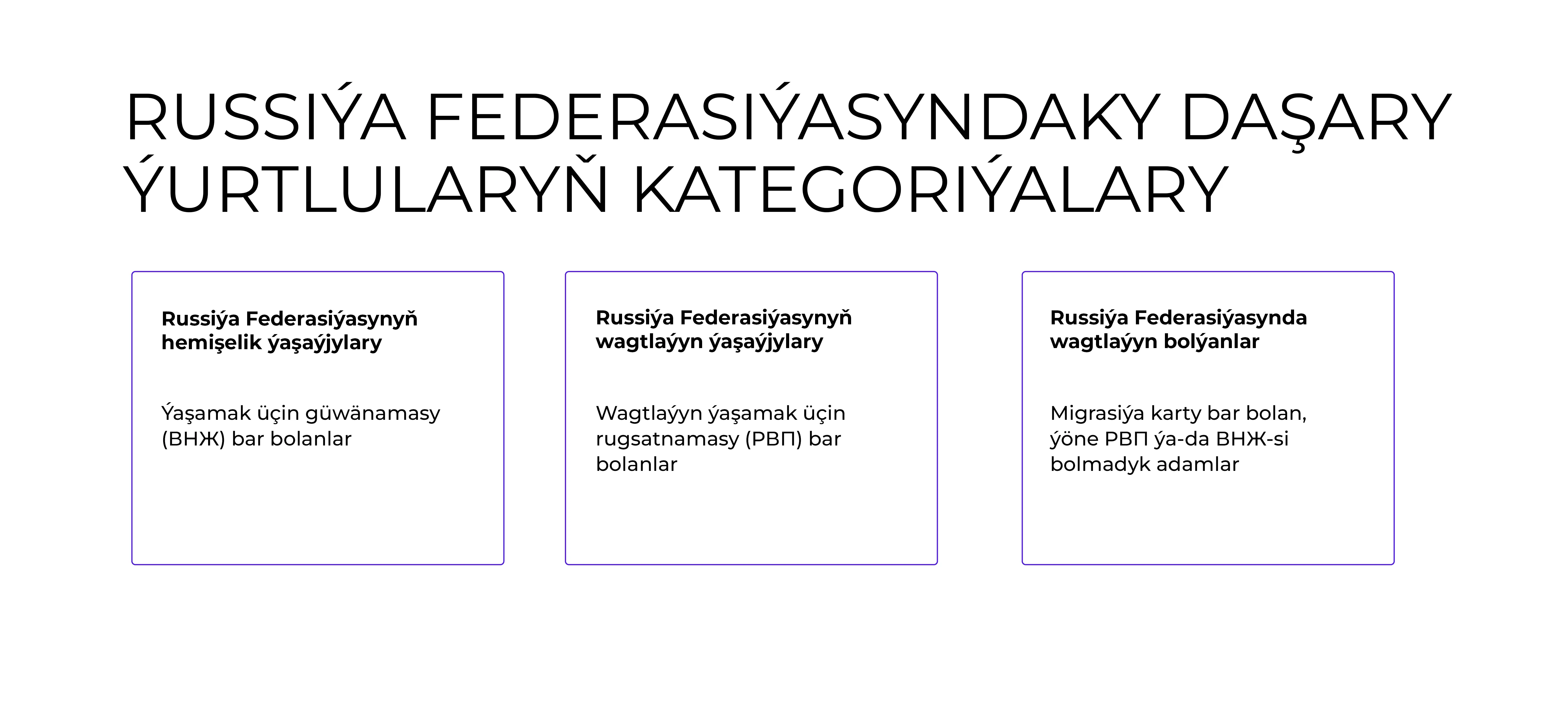 Russiýa Federasiýasynyň Konstitusiýasyna laýyklykda, daşary ýurtlular federal kanun ýa-da halkara şertnama bilen kesgitlenen käbir ýagdaýlardan başga halatlarda, rus raýatlary bilen deň hukuklara eýedir. Russiýa Federasiýasynyň çäginde bolýan daşary ýurt raýatlary 3 kategoriýa bölünýär: