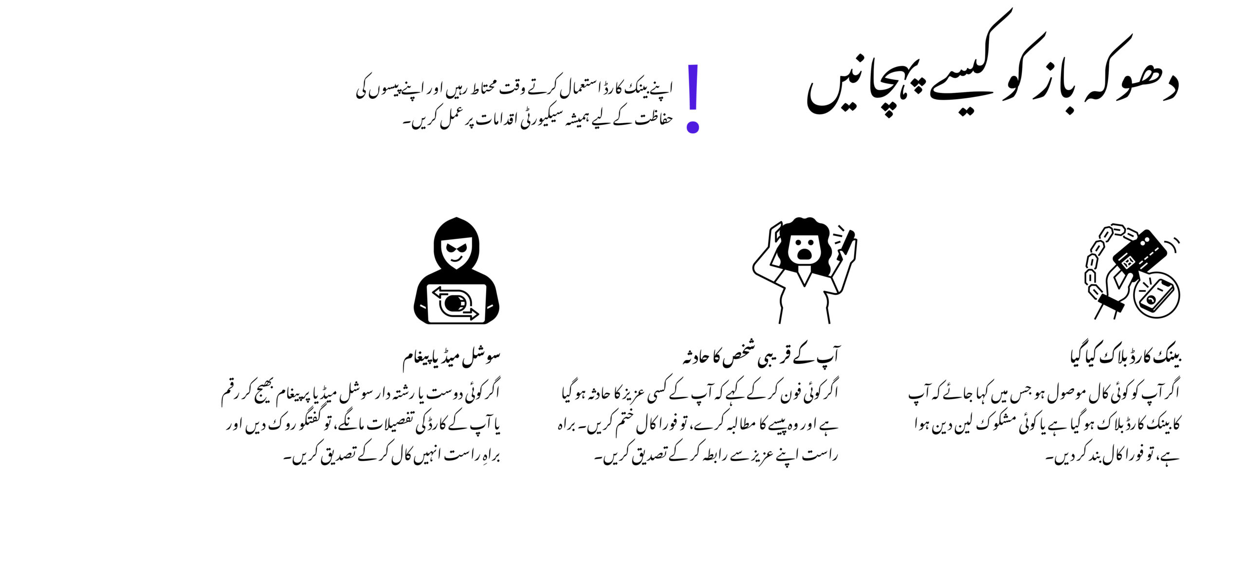 فون پر بات کرتے وقت محتاط اور ہوشیار رہنا ضروری ہے۔ فون پر کبھی بھی اپنی ذاتی معلومات جیسے پاس ورڈ یا کریڈٹ کارڈ نمبر نہ دیں۔ یاد رکھیں کہ بینک اور کمپنیاں فون پر ایسی معلومات طلب نہیں کرتی ہیں۔ اگر آپ کو کال کی حقیقت پر شک ہو تو فون بند کریں اور قابلِ اعتماد رابطہ معلومات کے ذریعے براہ راست اس ادارے سے رابطہ کریں۔ محتاط رہیں اور اپنی اندرونی سمجھ پر بھروسا کریں - یہ آپ کو دھوکے بازوں کے جال میں پھنسنے سے بچا سکتا ہے۔