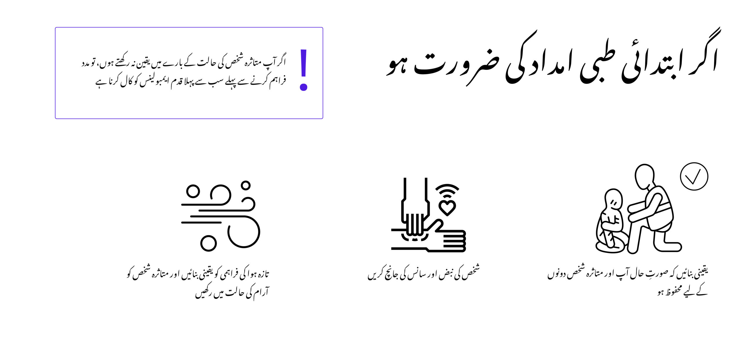 اگر کوئی زخمی ہو تو اس کی مدد کریں اور ایمبولینس کو کال کریں۔