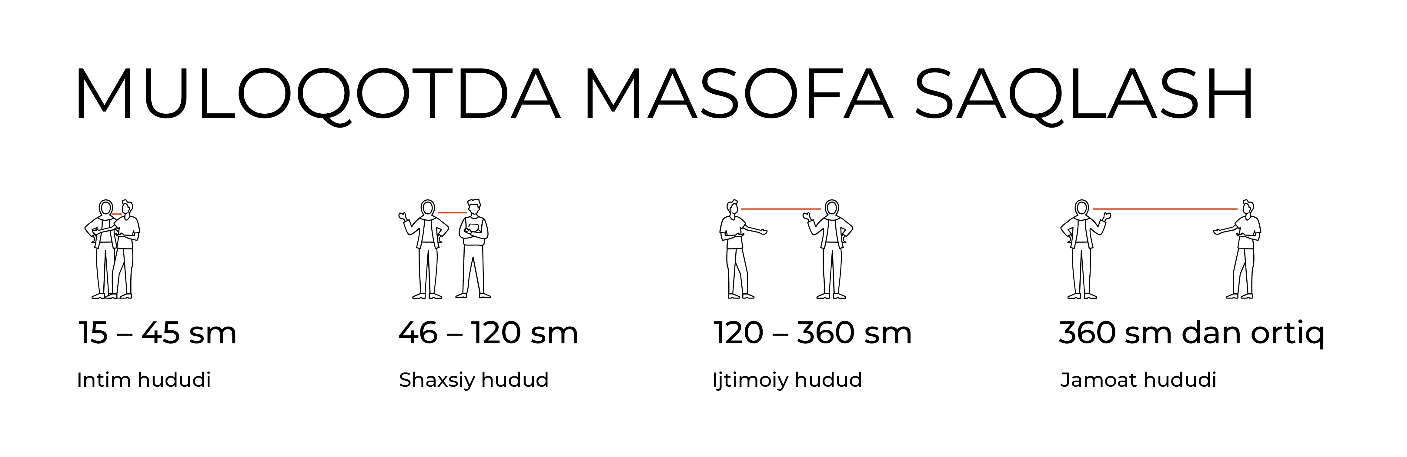 Psixologik qulaylik, shaxsiy xavfsizlik va infeksiyalar tarqalishining oldini olish uchun odamlar orasidagi masofani saqlash kerak. Masofa sizning tanishingizning yaqinligi, yoshi, jinsi, ijtimoiy rollari va muloqot vaziyatiga bogʻliq.