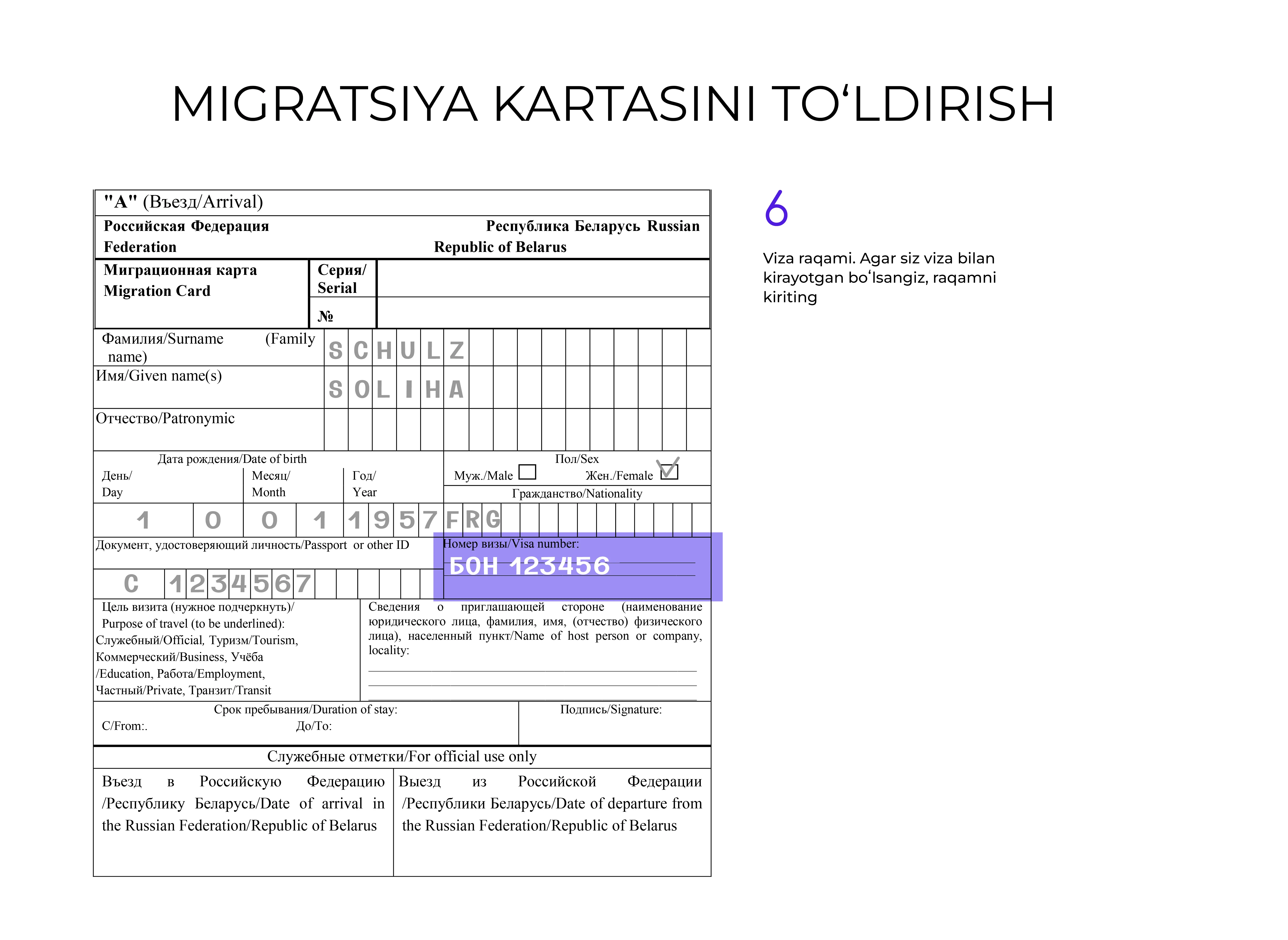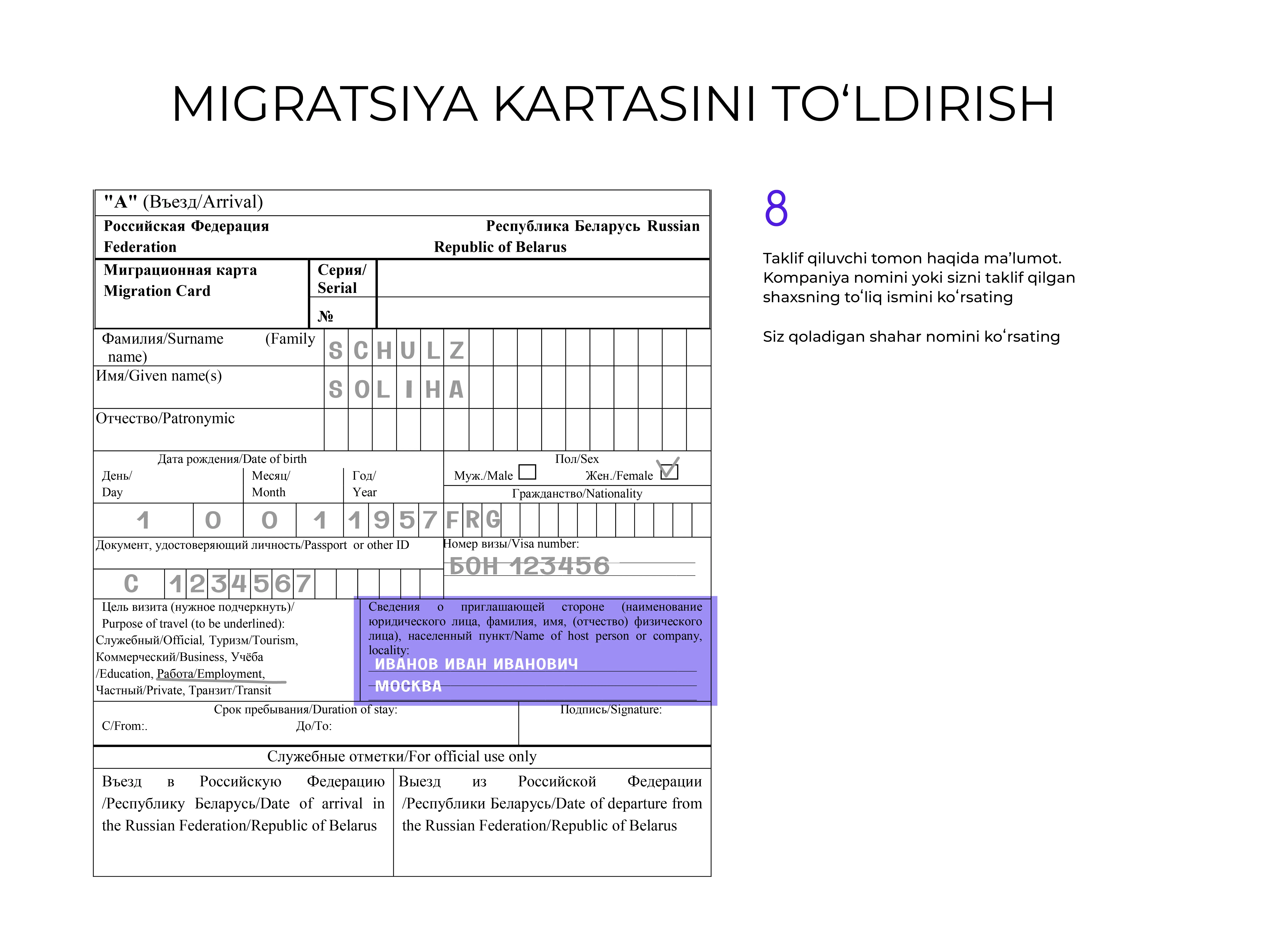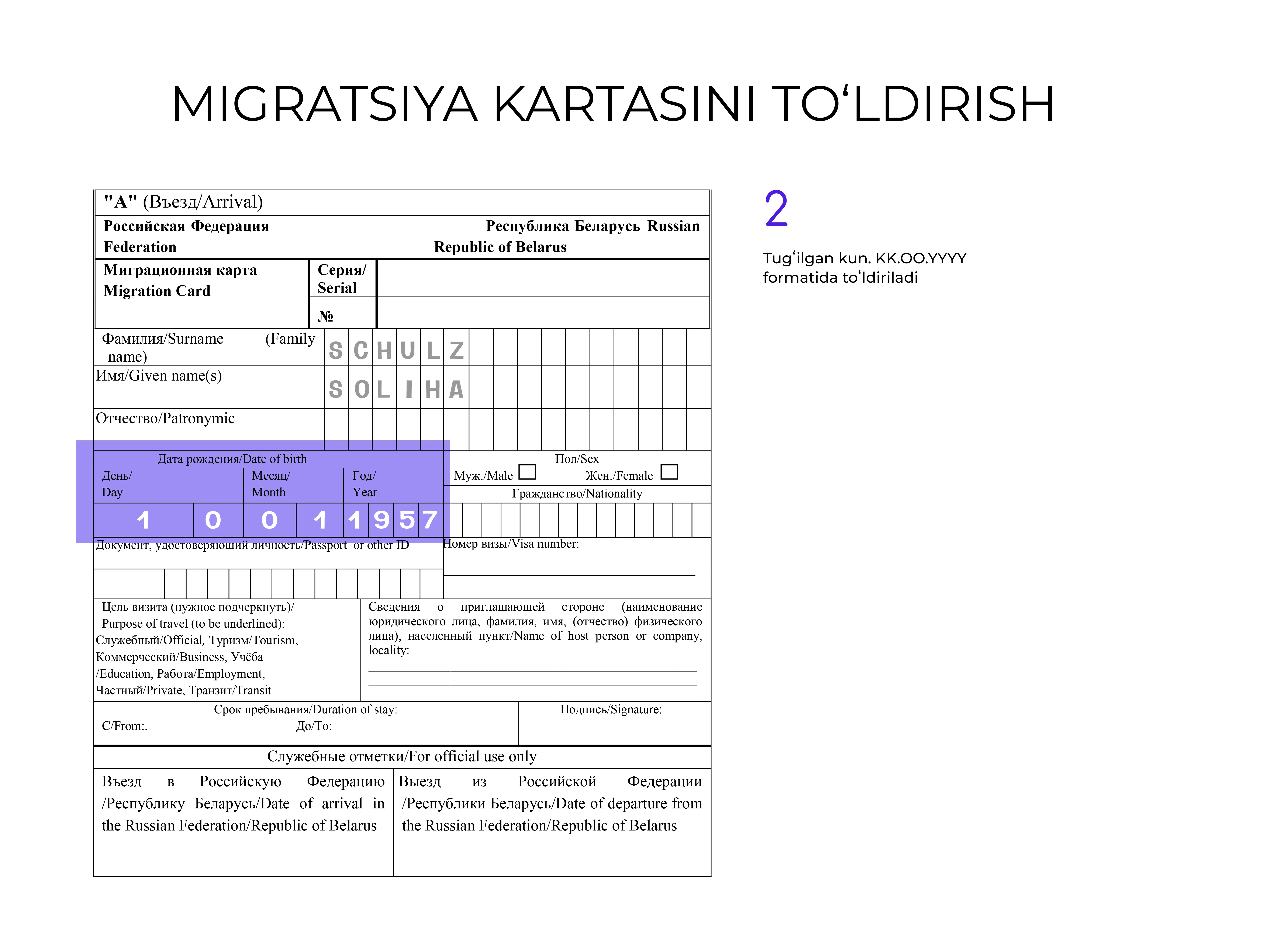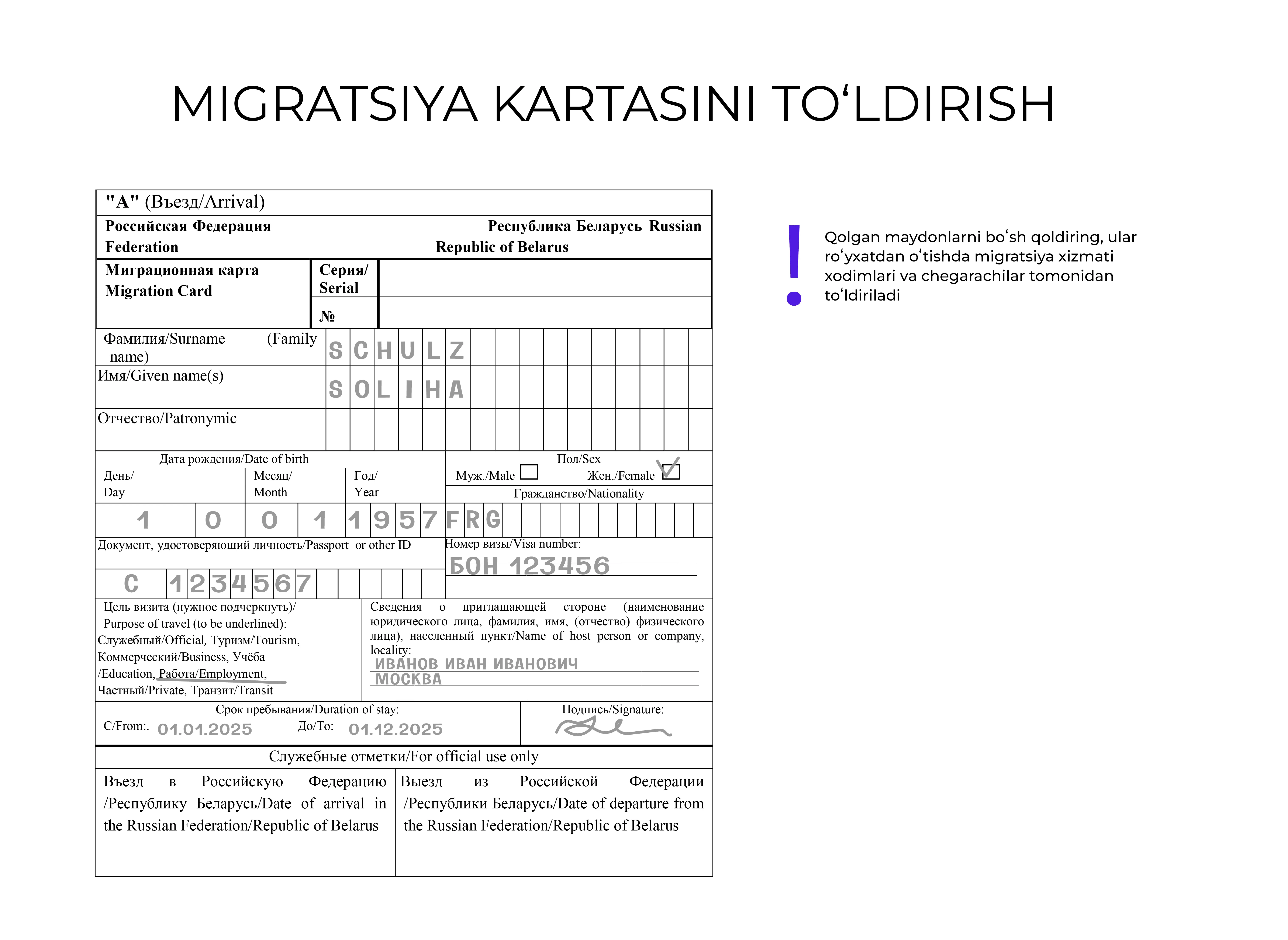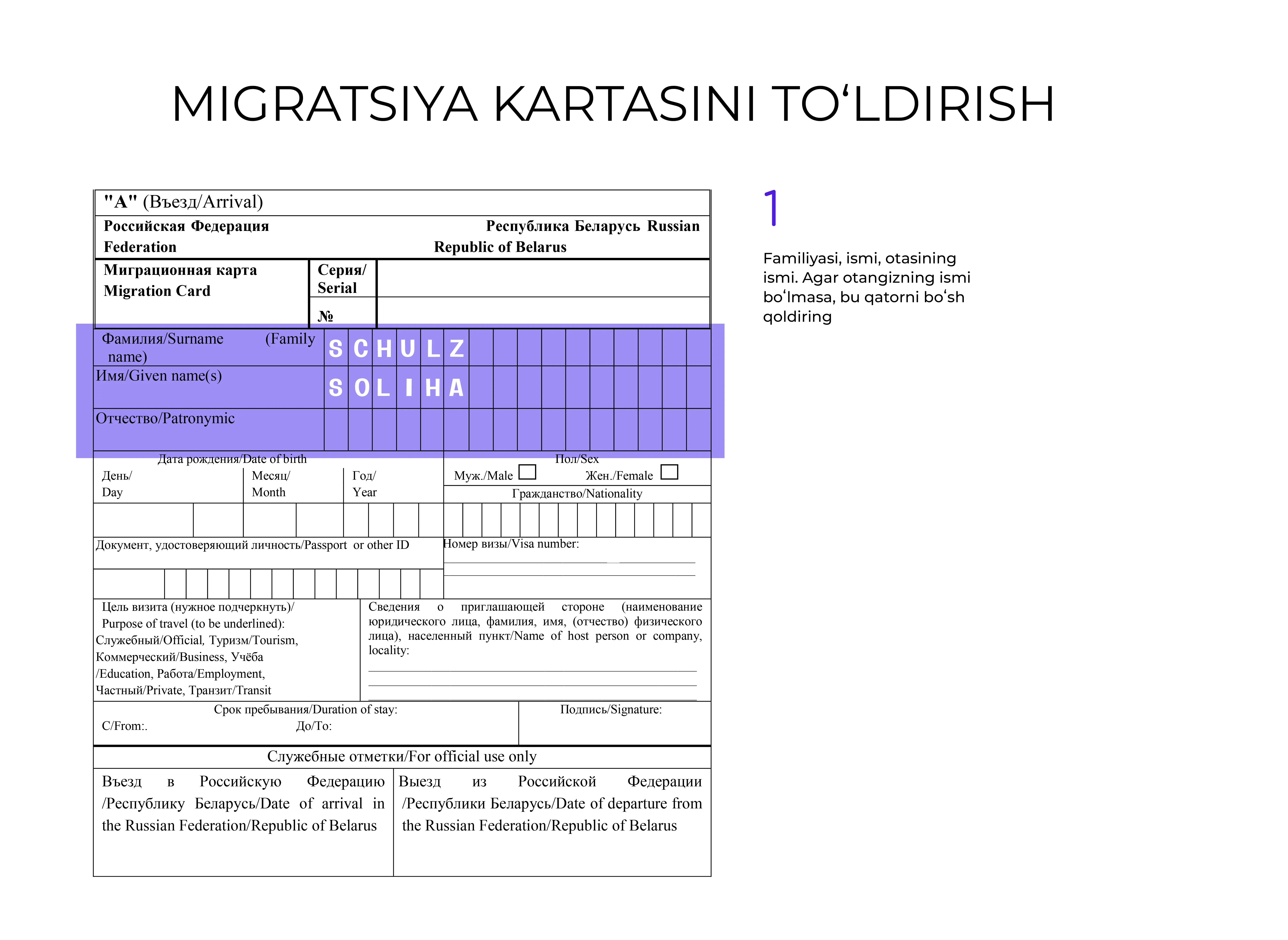 Hujjatni rus tilida toʻldirish tavsiya etiladi, lekin u lotin harflarida ham amalga oshirilishi mumkin.