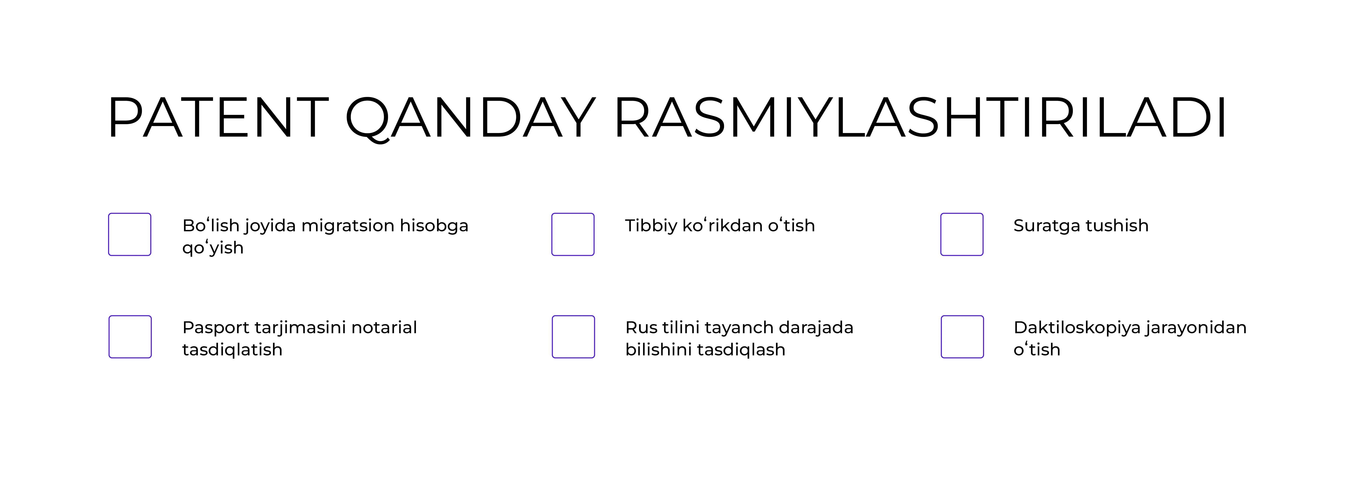 migratsiya hisobiga kirishingiz, pasportingizni tarjima qildirib, notarial tasdiqlatishingiz, tibbiy ko‘rikdan o‘tishingiz, rus tili bo‘yicha boshlang‘ich bilimingizni tasdiqlashingiz, suratga olishingiz va daktiloskopiyadan o‘tishingiz kerak. Patent ham, ishga ruxsatnoma ham Ichki ishlar vazirligining (МВД) migratsiya bo‘limlari tomonidan beriladi.