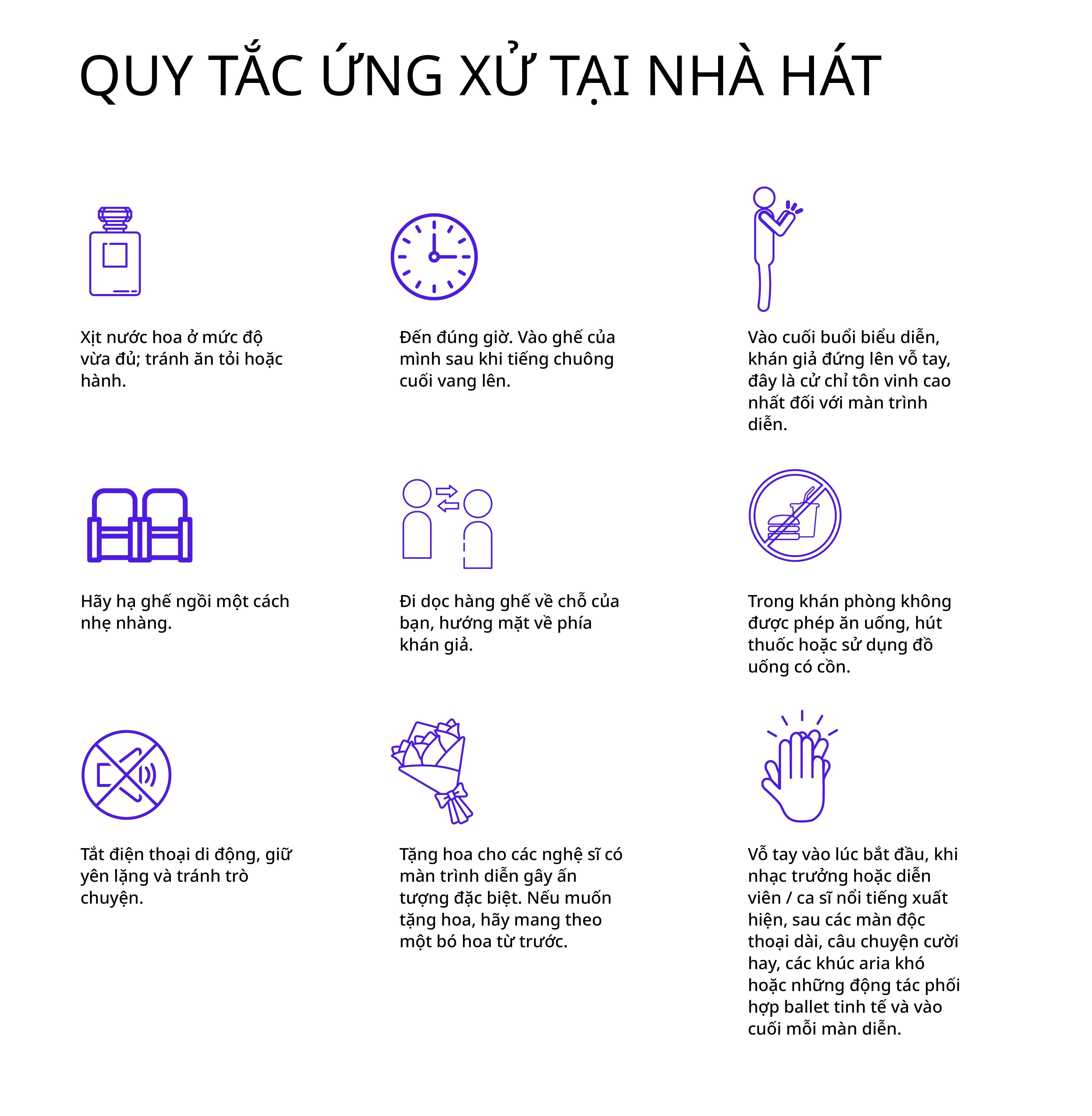- Trước khi đến nhà hát, bạn nên tránh ăn các món có hành hoặc tỏi và không nên dùng quá nhiều nước hoa.