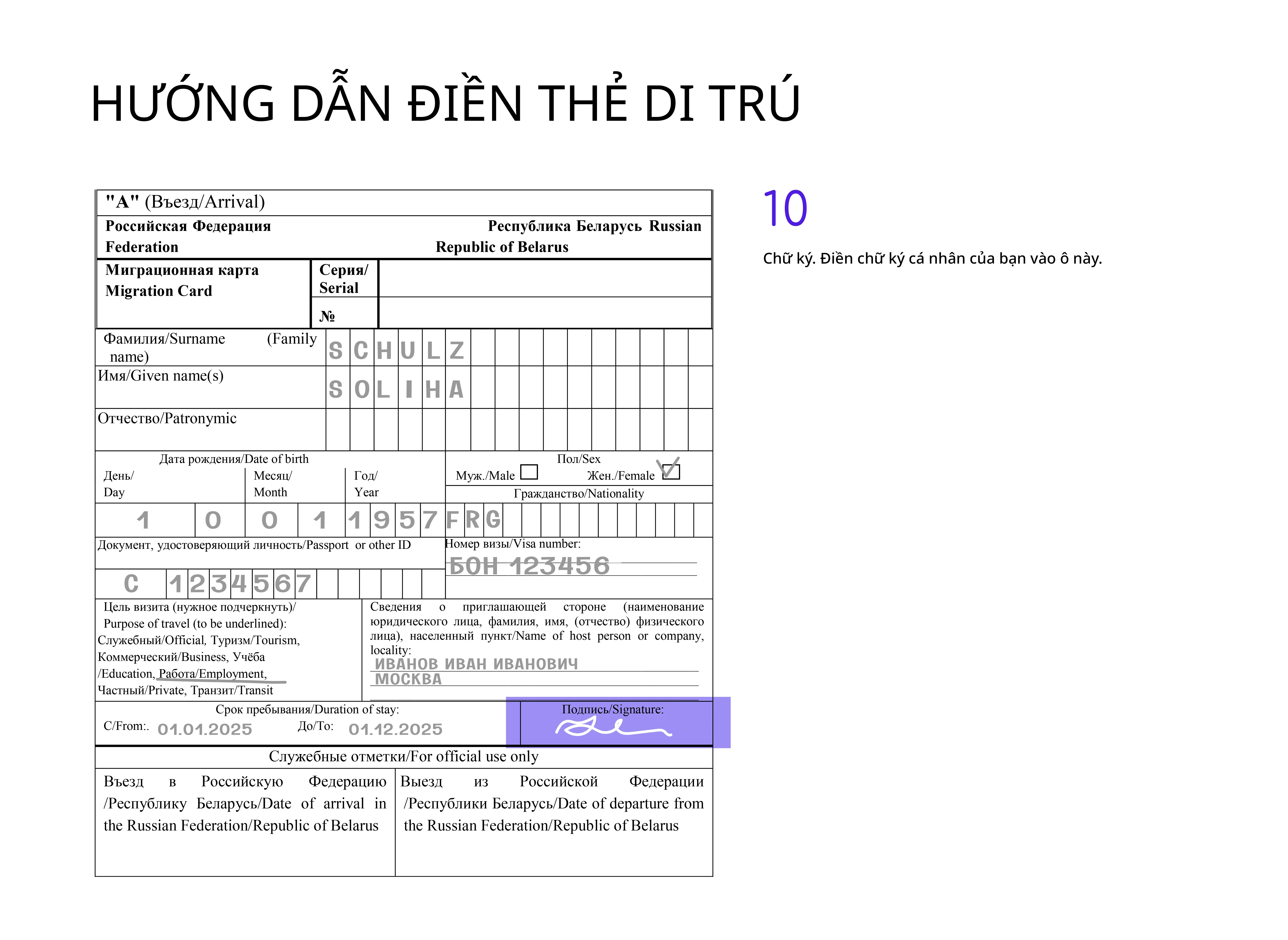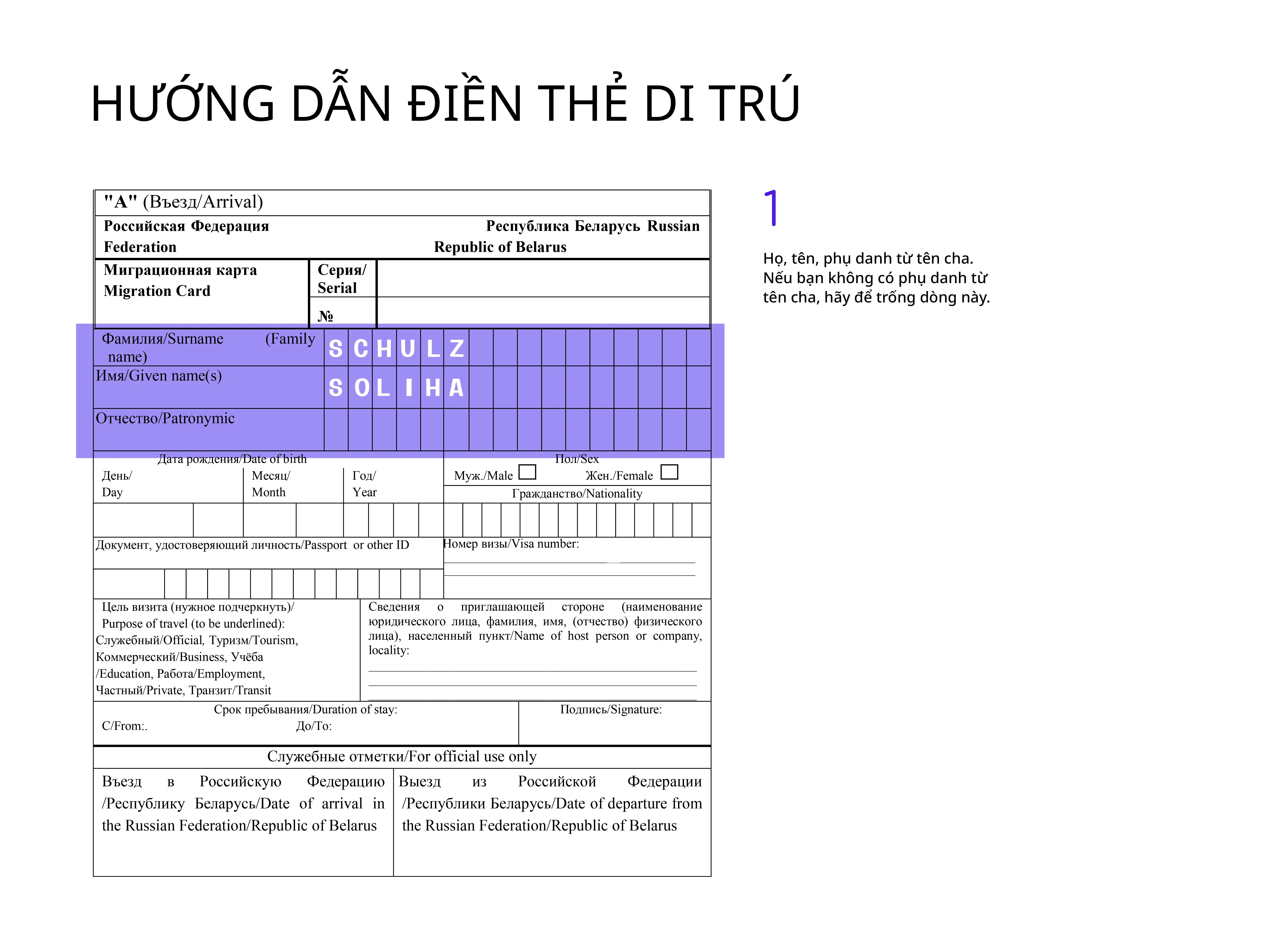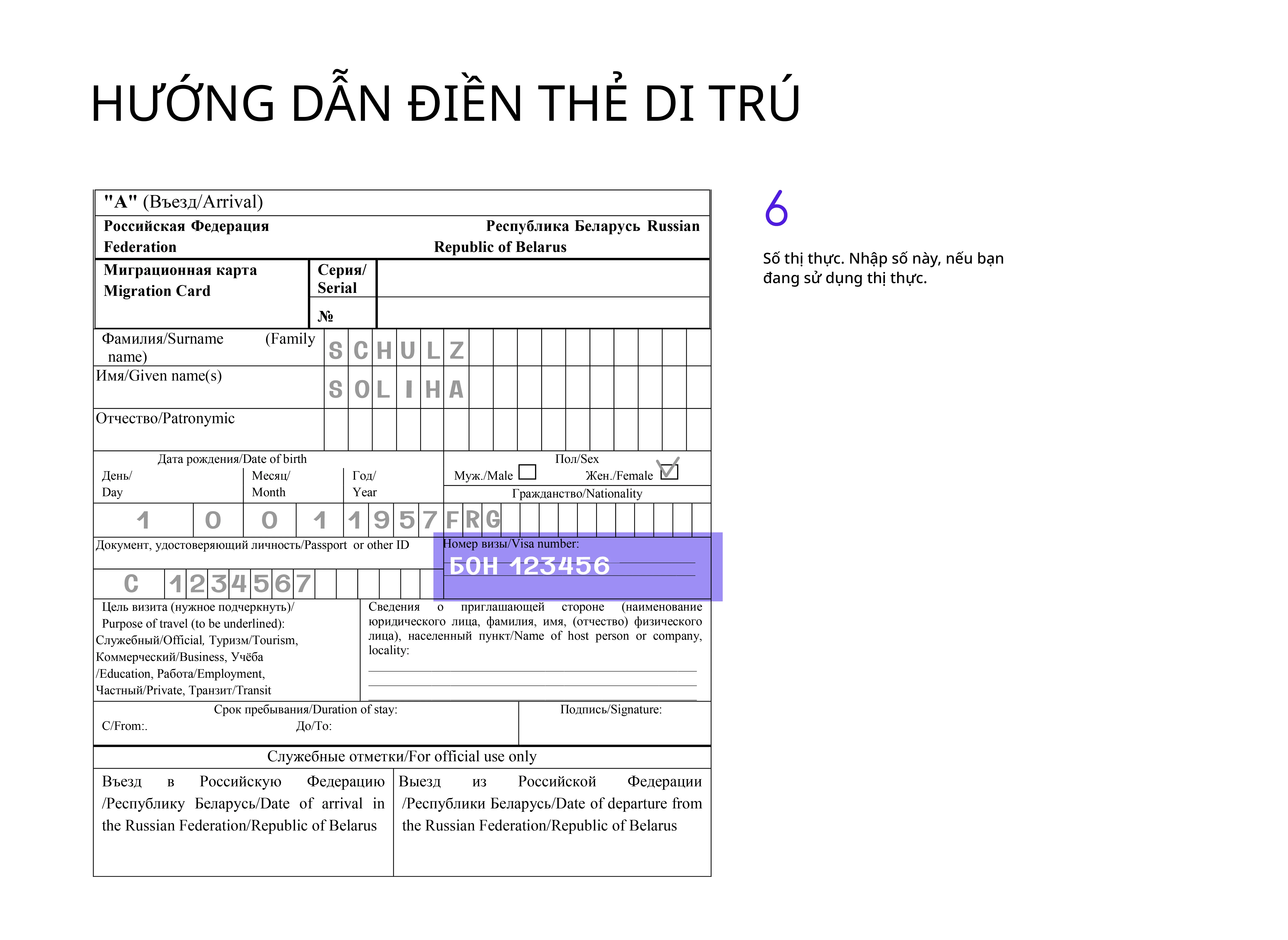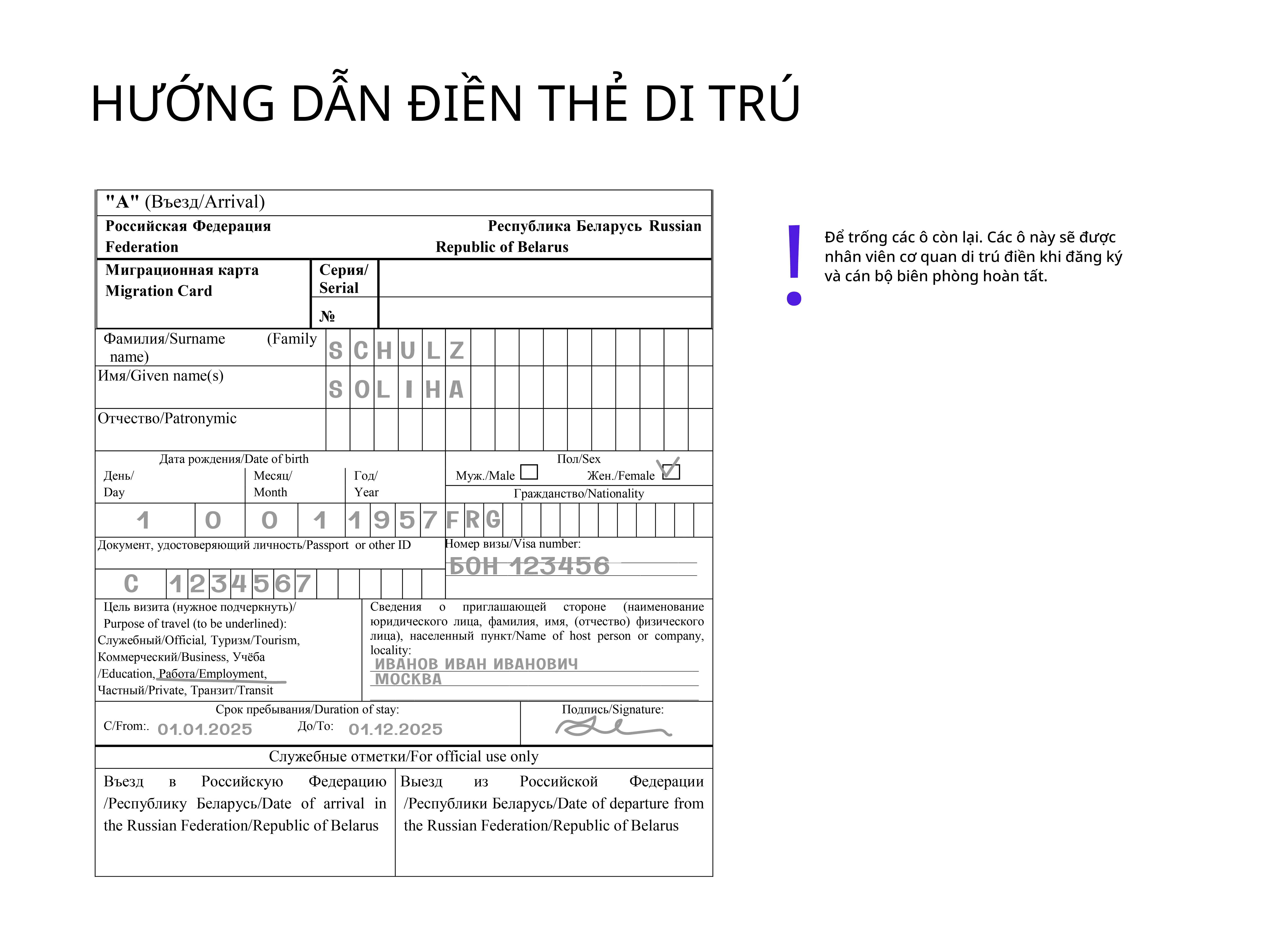 Tốt nhất là điền thẻ di trú bằng tiếng Nga, nhưng dùng chữ Latinh cũng được chấp nhận.