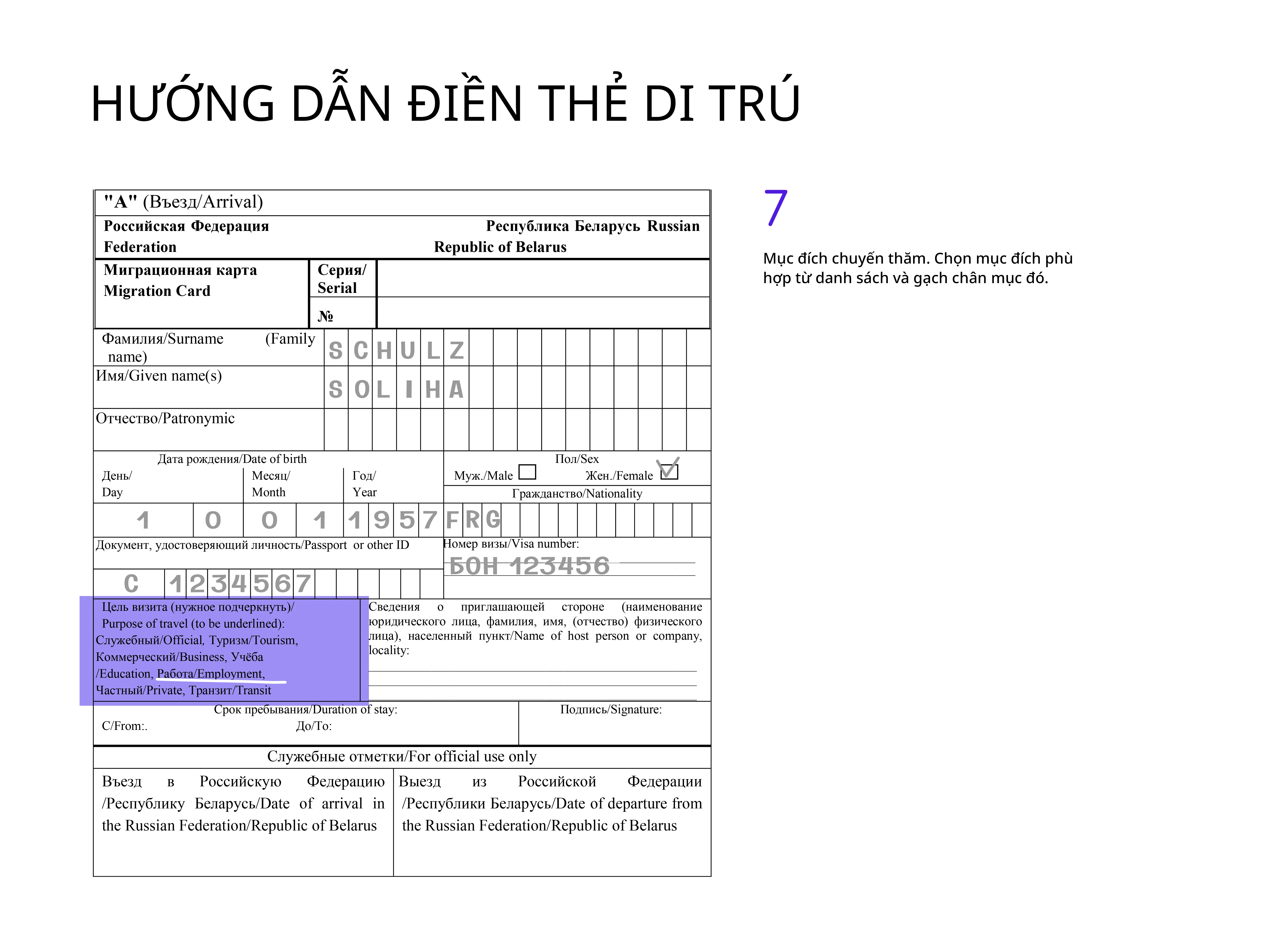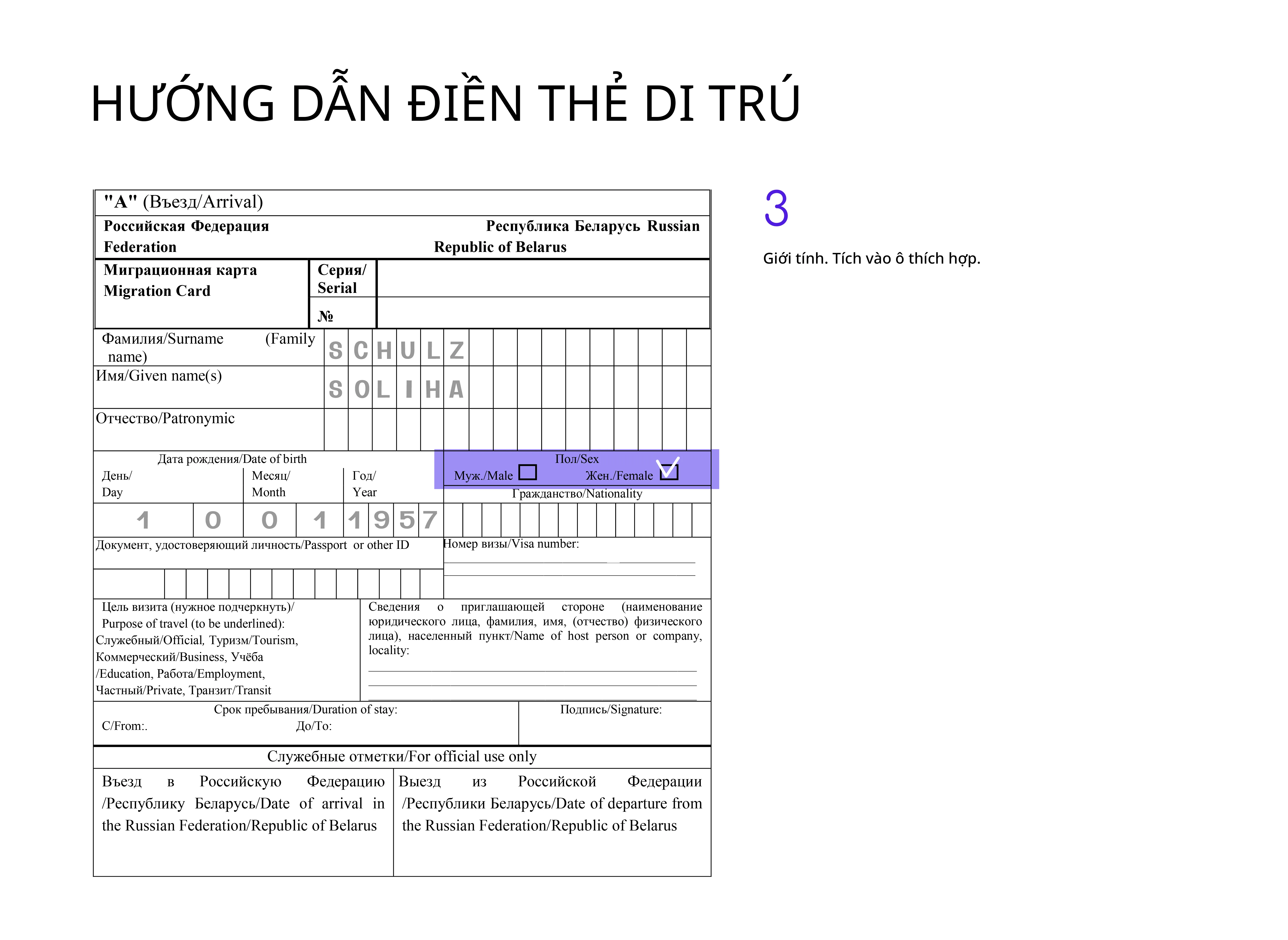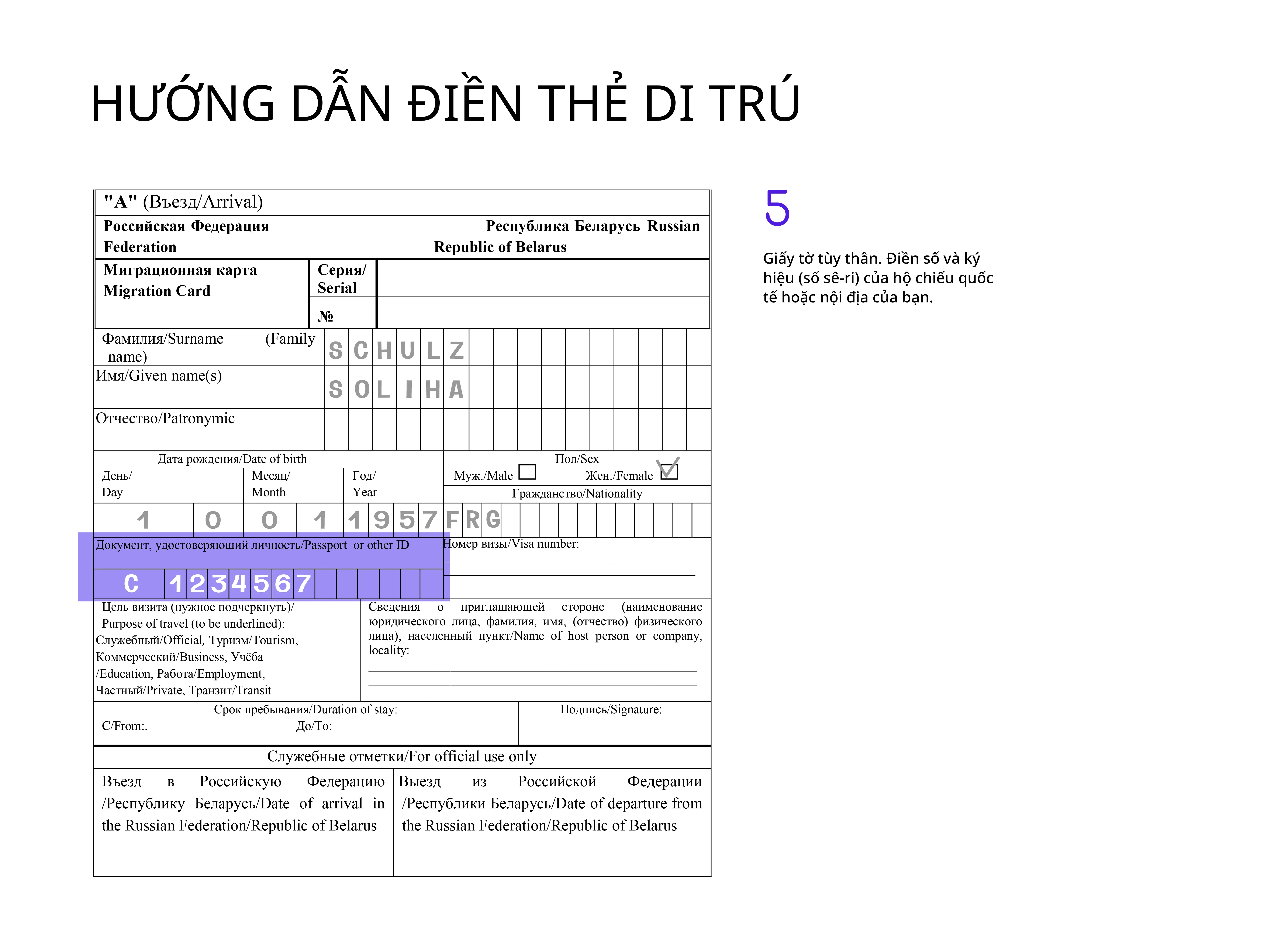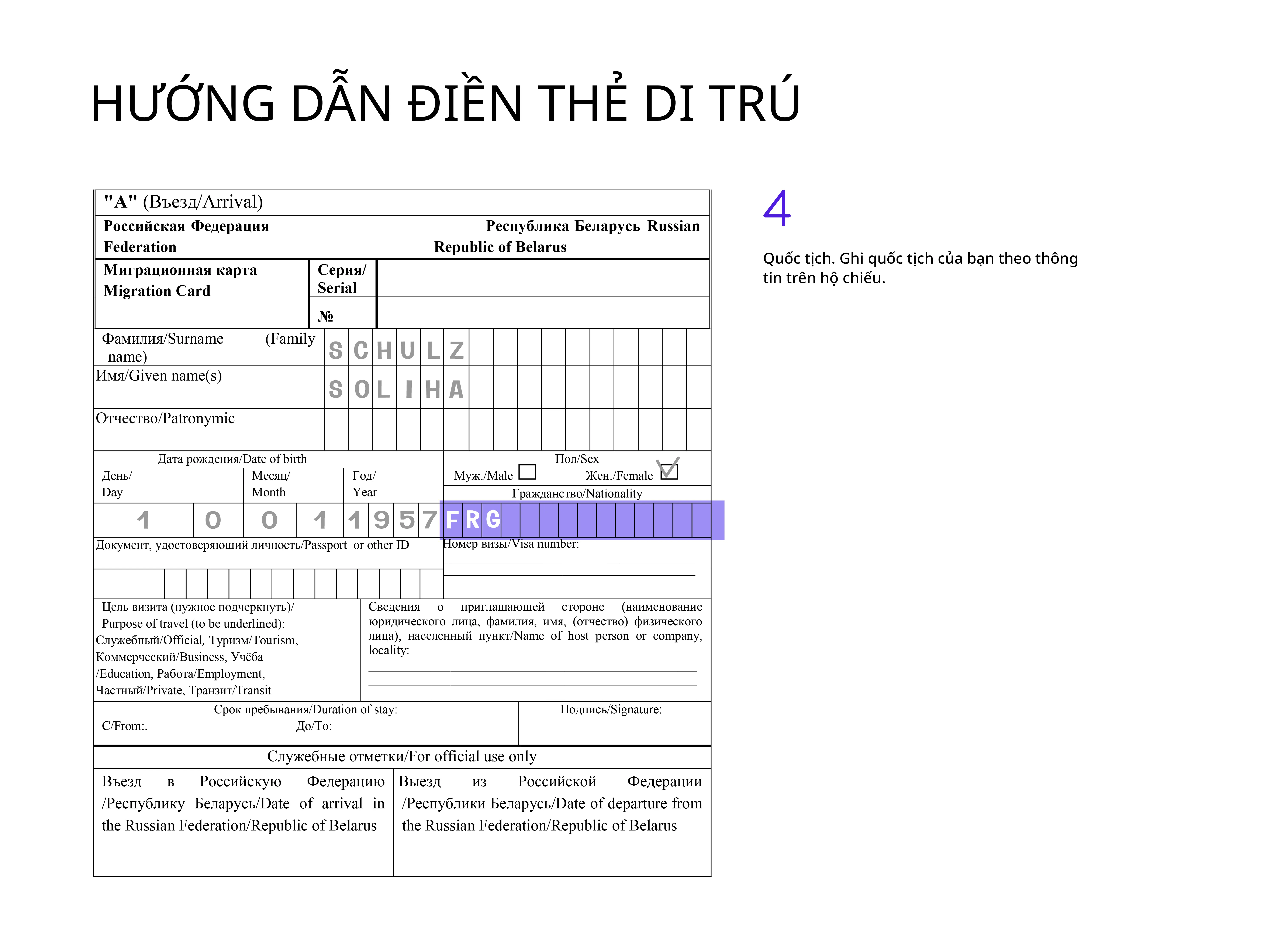 Tốt nhất là điền thẻ di trú bằng tiếng Nga, nhưng dùng chữ Latinh cũng được chấp nhận.